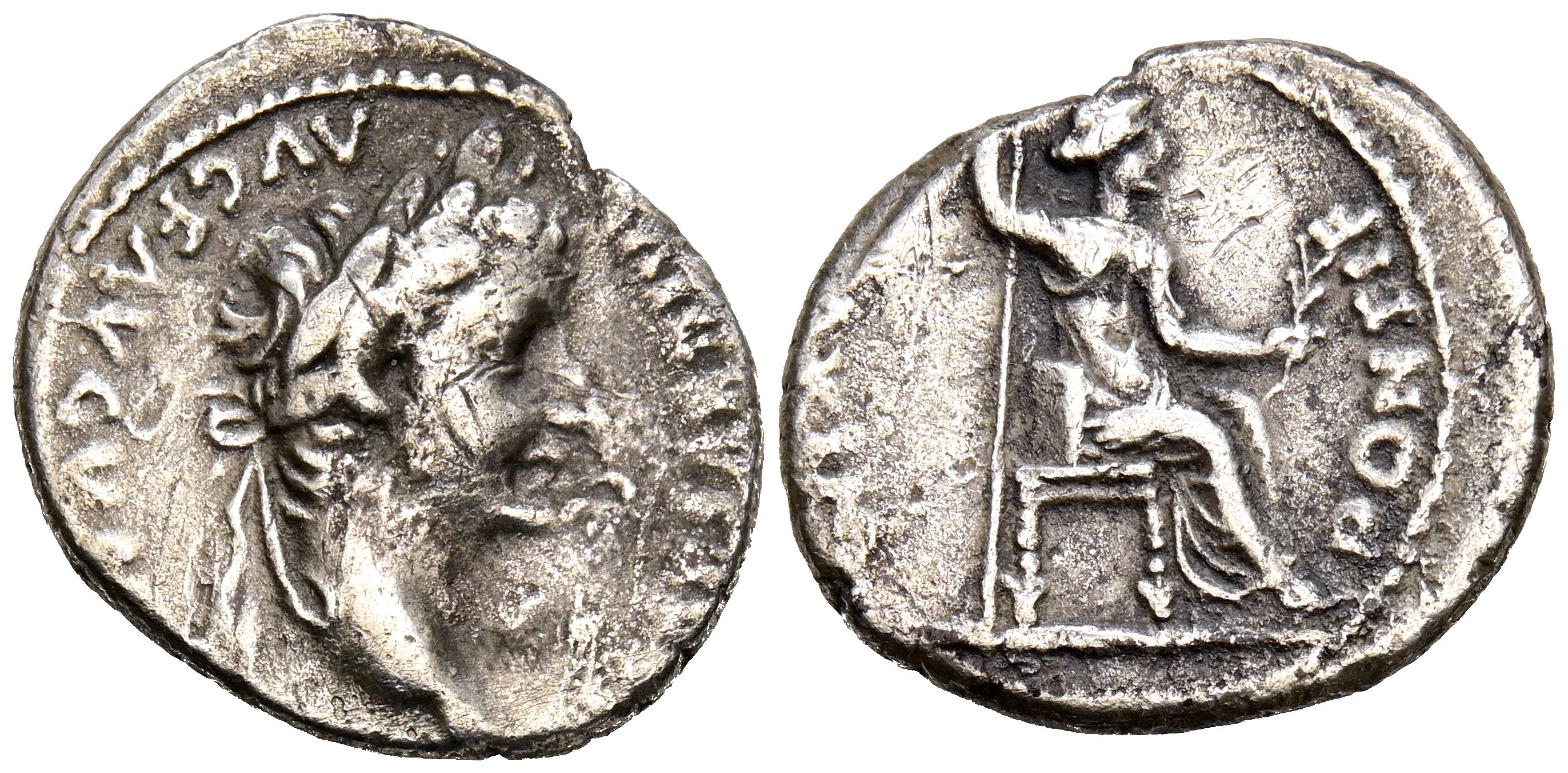 TIBERIO. Denario. (Ar. 3,62g/20mm). 14-37 d.C. Lugdunum. (RIC 30). Anv: Cabeza laureada de Tiberio a derecha portando cetro, alrededor leyenda: TI CAESAR DIVI AVGVSTVS. Rev: Livia sentada a derecha, alrededor leyenda: MAXIM PONTIF. MBC.
