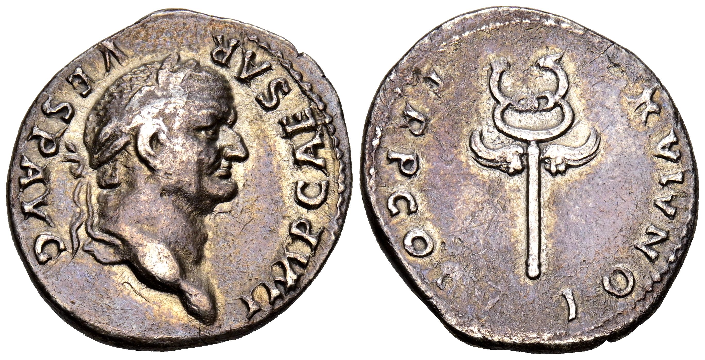 VESPASIANO. Denario. (Ar. 2,80g/20mm). 74 d.C. Roma. (RIC 703). Anv: Cabeza laureada de Vespasiano a derecha, alrededor leyenda: IMP CAESAR VESP AVG. Rev: Caduceo alado, alrededor leyenda: PON MAX TR P COS V. MBC+. Bonita pátina.