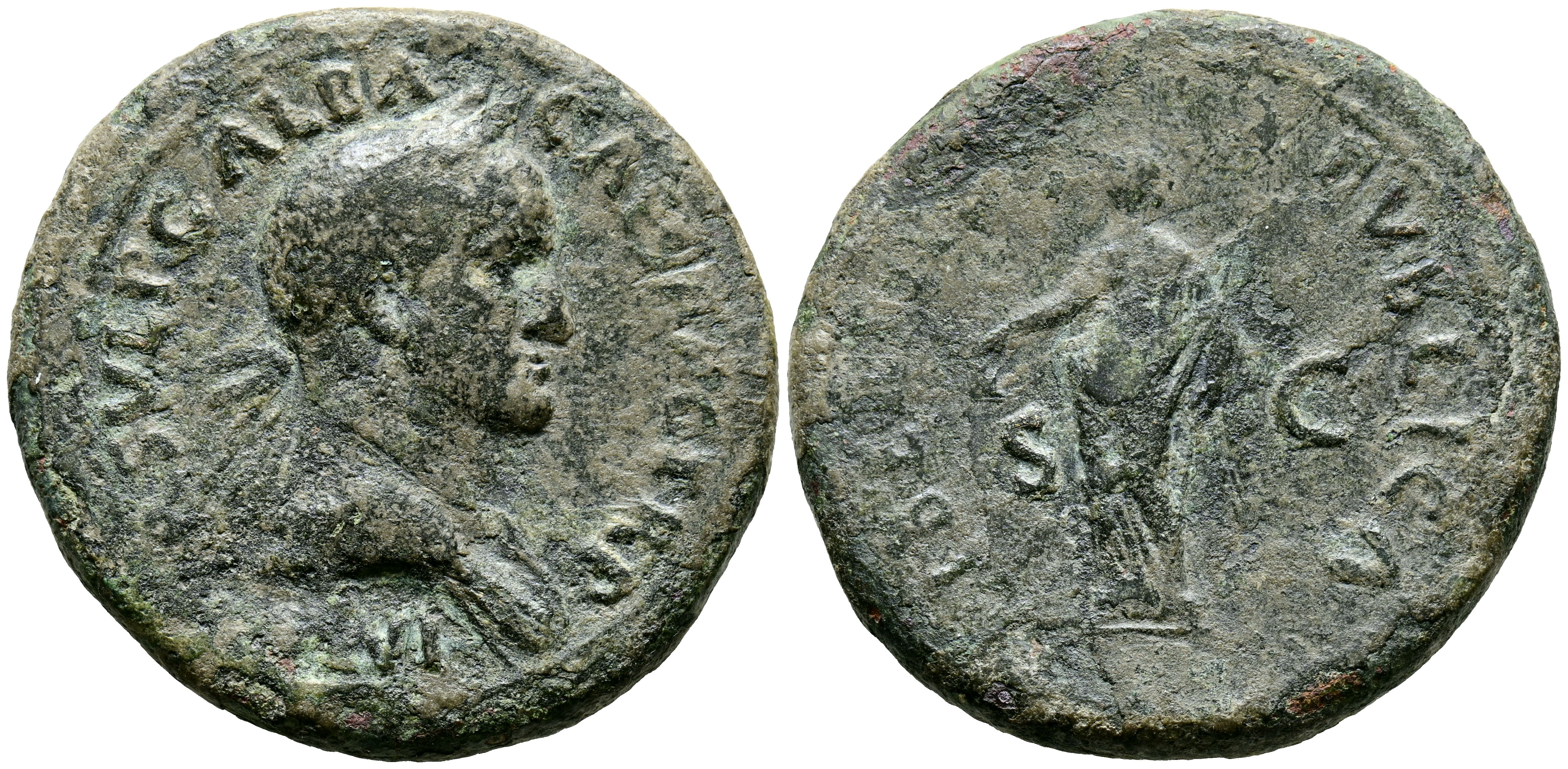 GALBA. Sestercio. (Ae. 24,50g/36mm). 68 d.C. Roma. (RIC 310). Anv: Busto laureado y drapeado de Galba a derecha, alrededor leyenda: IMP SER SVLPIC GALBA CAES AVG TR P. Rev: Libertas estante a izquierda portando pÃleo y cetro, entre S-C, alrededor leyenda: LIBERTAS PVBLICA. MBC. Limpiado y repatinado. Escaso ejemplar.