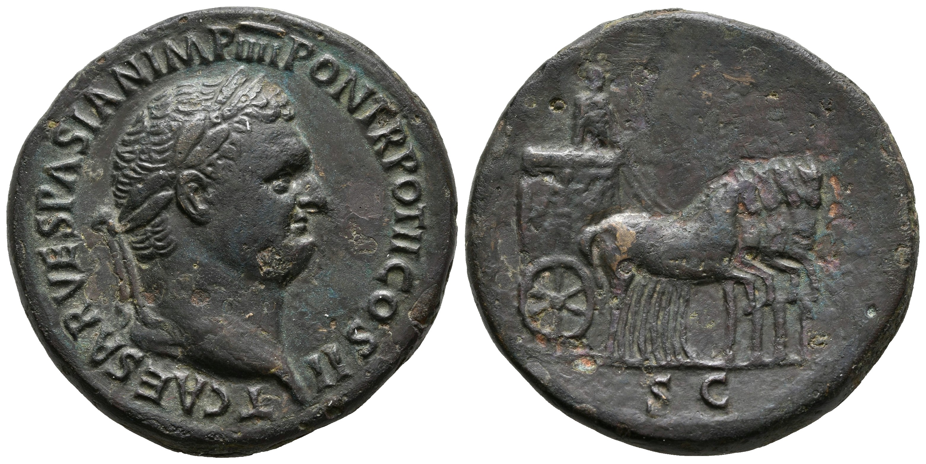TITO. Sestercio. (Ae. 23,75g/33mm). 72-73 d.C. Roma. Anv: T CAESAR VESPASIAN IMP IIII PON TR POT II COS II. Busto laureado a derecha de Tito. Rev: Tito estante a derecha sobre carro tirado por cuádriga triunfal. (RIC 498). MBC+/MBC. Retocado. Muy raro ejemplar.
