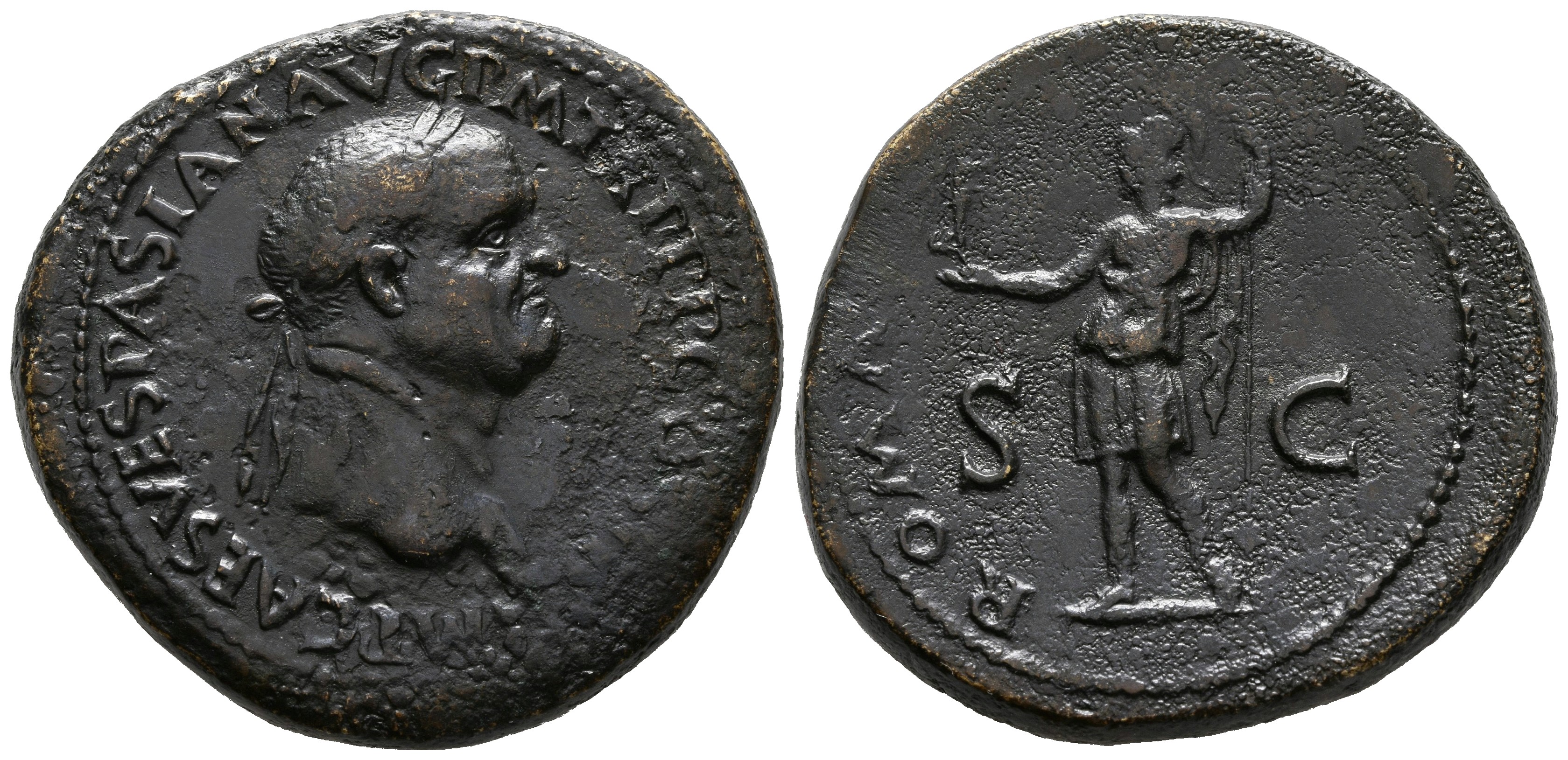 VESPASIANO. Sestercio. (Ae. 28,06g/36mm). 71 d.C. Roma. (RIC 190). Anv: IMP CAES VESPASIAN AVG PM TR P P P COS III. Busto laureado a derecha de Vespasiano. Rev: Roma estante a izquierda portando Victoria y lanza, delante ROMA. MBC. Escaso.