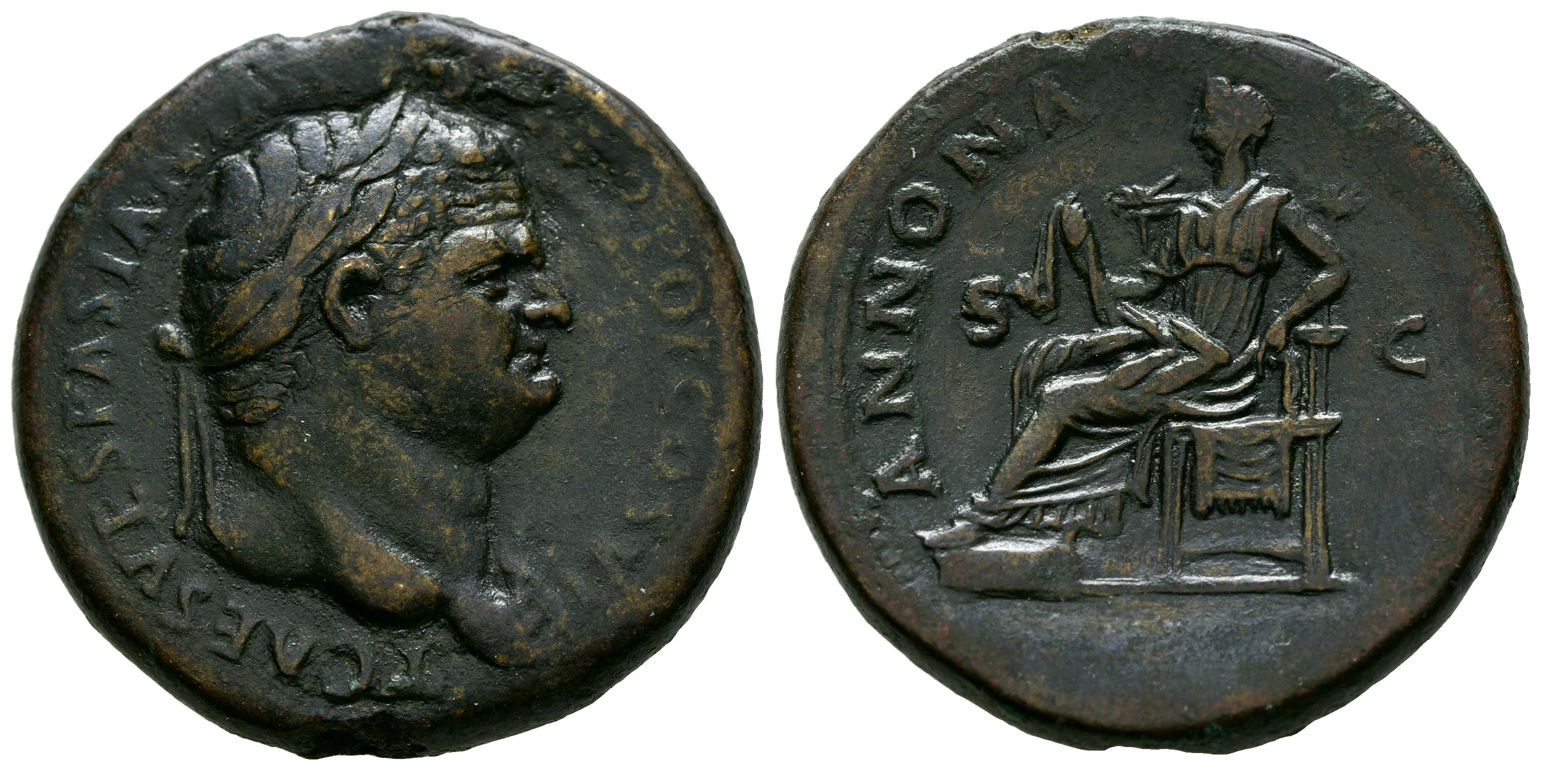 TITO. Sestercio. (Ae. 24,67g/33mm). 77-78 d.C. Roma. (RIC 1021). Anv: Cabeza laureada de Tito a derecha, alrededor leyenda: T CAES VESPASIAN IMP PONT TR POT COS VI. Rev: Annona sentada a izquierda portando saca con espigas, entre: S-C, alrededor leyenda: ANNONA AVGVST. MBC. Raro ejemplar.