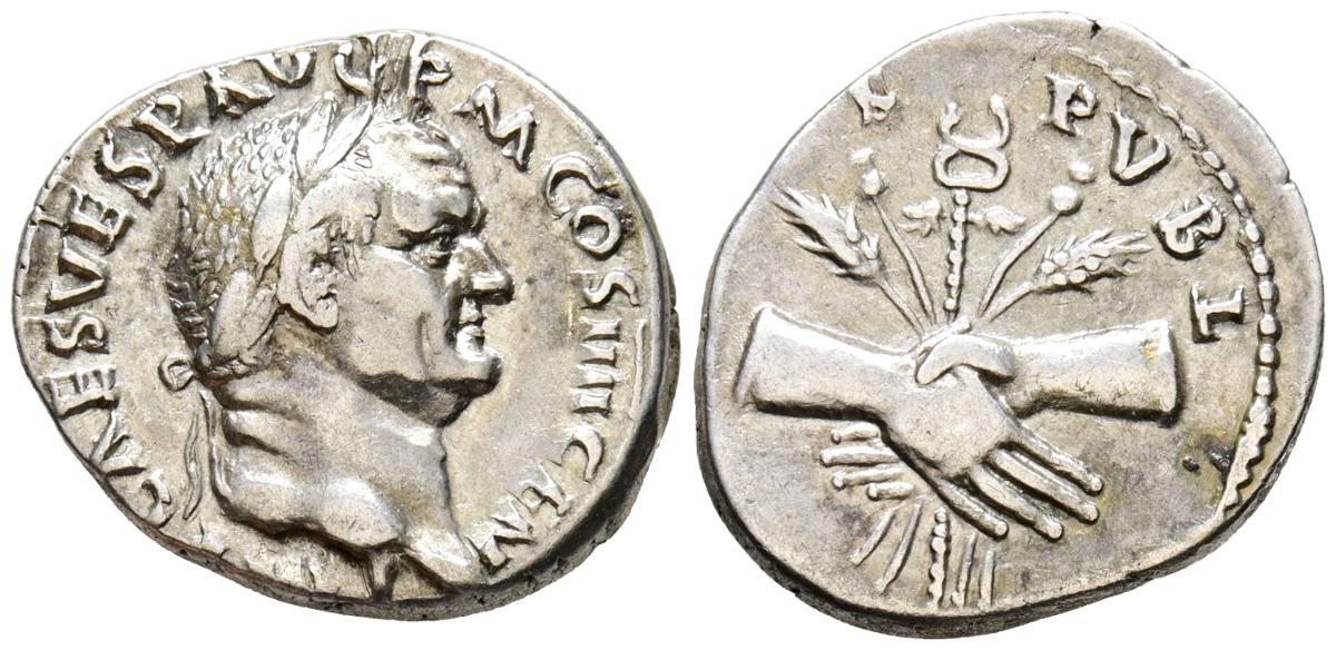 VESPASIANO. Denario. (Ar. 3,42g/19mm). 73 d.C. Roma. (RIC 520). Anv: Cabeza laureada de Vespasiano a derecha, alrededor leyenda: IMP CAES VESP AVG P M COS IIII CEN. Rev: Manos entrelazadas, detrás caduceo con espigas, encima leyenda: FIDES PVBL. MBC+. Escaso ejemplar.