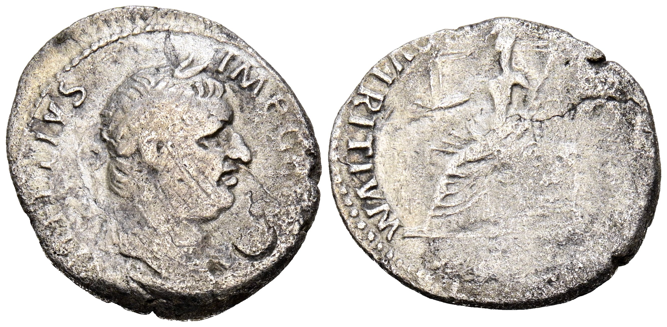VITELIO. Denario. (Ar. 3,19g/19mm). 69 d.C. Lugdunum. (RIC 59). Anv: Cabeza laureada de Vitelio a derecha, alrededor leyenda: A VITELLIVS IMP GERMAN. Rev: Vesta velada sentada a izquierda portando antorcha y patera, alrededor leyenda: VESTA P R QVIRITIVM. MBC-.