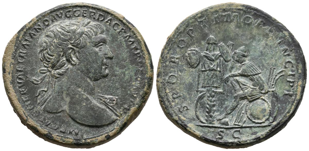 TRAJANO. Sestercio. (Ae. 28,10g/34mm). 108-110 d.C. Roma. Anv: IMP CAES NERVAE TRAIANO AVG GER DAC P M TR PCOS V P P. Busto laureado con ligero drapeado sobre hombro izquierdo a derecha de Trajano. Rev: SPQR OPTIMO PRINCIPI. Dacia sentada sobre escudo hexagonal a izquierda, delante trofeo. (RIC 564). MBC+. Campos rebajados y repatinado.