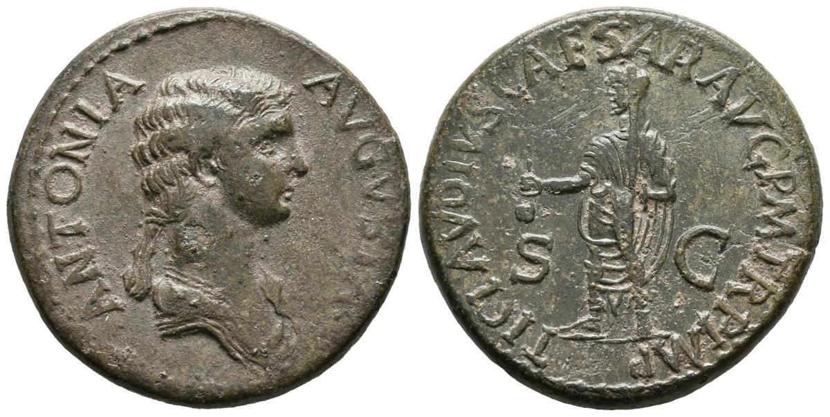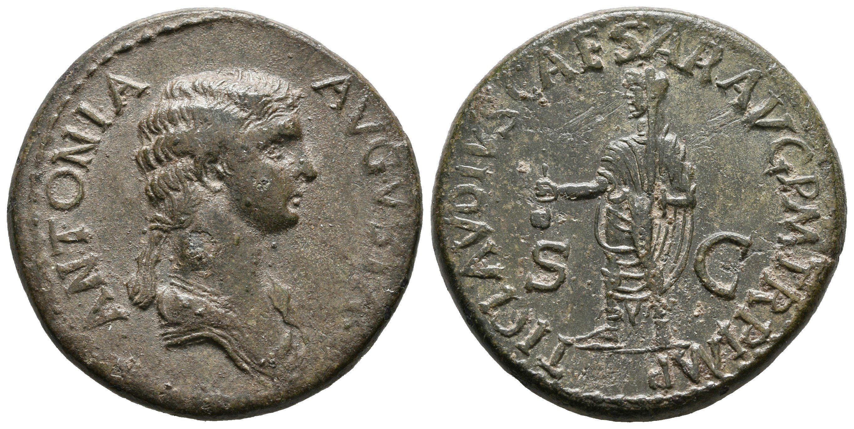 ANTONIA. Dupondio. (Ae. 12,89g/29mm). 41-42 d.C. Roma. Anv: ANTONIA AVGVSTA. Busto drapeado con el pelo recogido a derecha de Antonia. Rev: TI CLAVDIVS CAESAR AVG P M TR P IMP P P. Claudio estante velado a izquierda portando sÃmpulo. (RIC 92). EBC-. Bonito y escaso ejemplar.