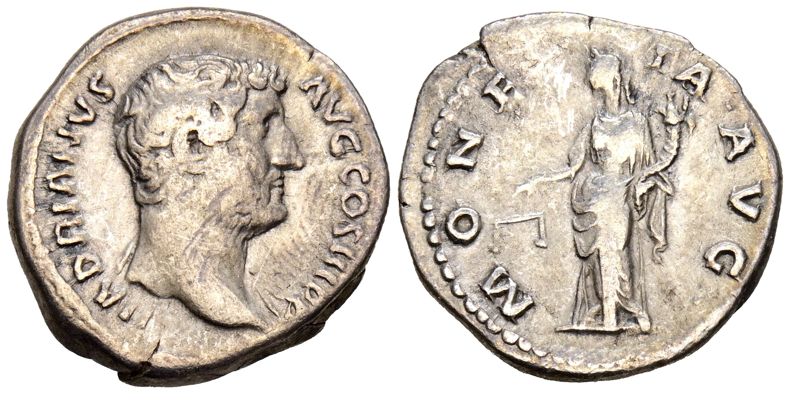 ADRIANO. Denario. (Ar. 2,80g/18mm). 136 d.C. Roma. (RIC 2224). Anv: Cabeza de Adriano a derecha, alrededor leyenda: HADRIANVS AVG COS III P P. Rev: Moneta estante a izquierda portando escalas y cornucopia, alrededor leyenda: MONETA AVG. MBC+.