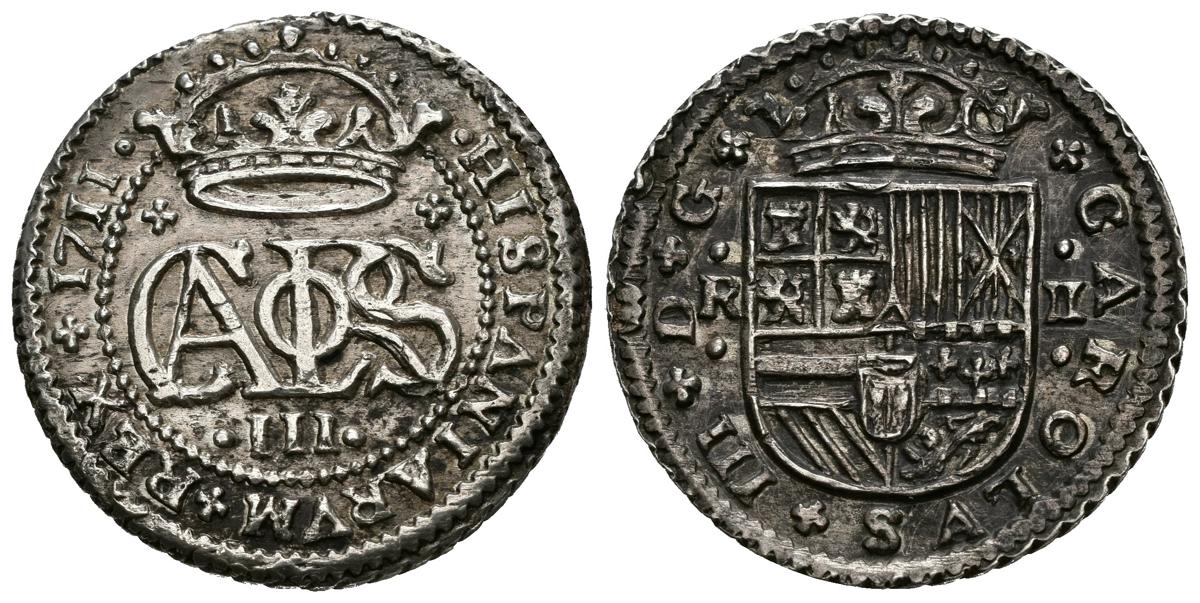CARLOS III, el Pretendiente (1700-1714). 2 Reales. (Ar. 5,91g/27mm). 1711. Barelona. (Cal-2019-32). EBC. Espectacular pieza tanto por sus relieves como por su tono.