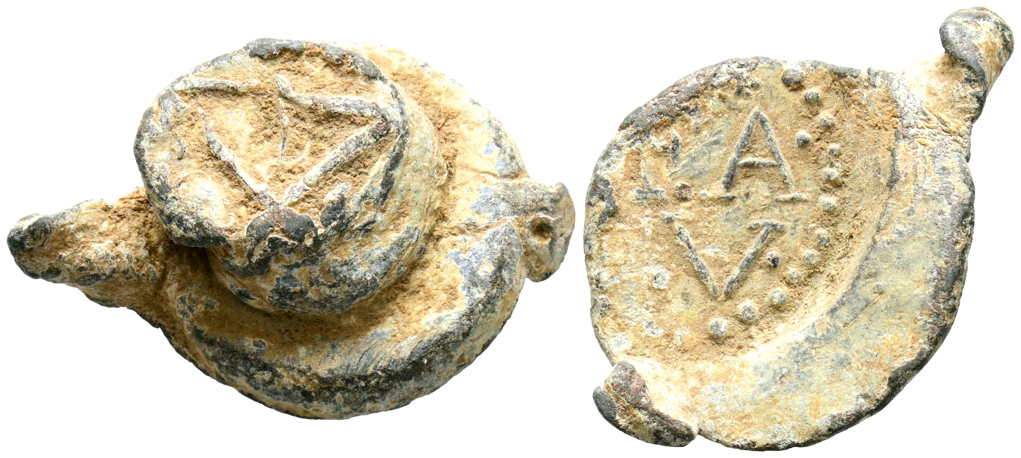 Precinto o plomo de saca. (Pb. 11,21g/27x18x6mm). Anv: F.A.V. Rev: ¿Triángulo? MBC. Escaso.