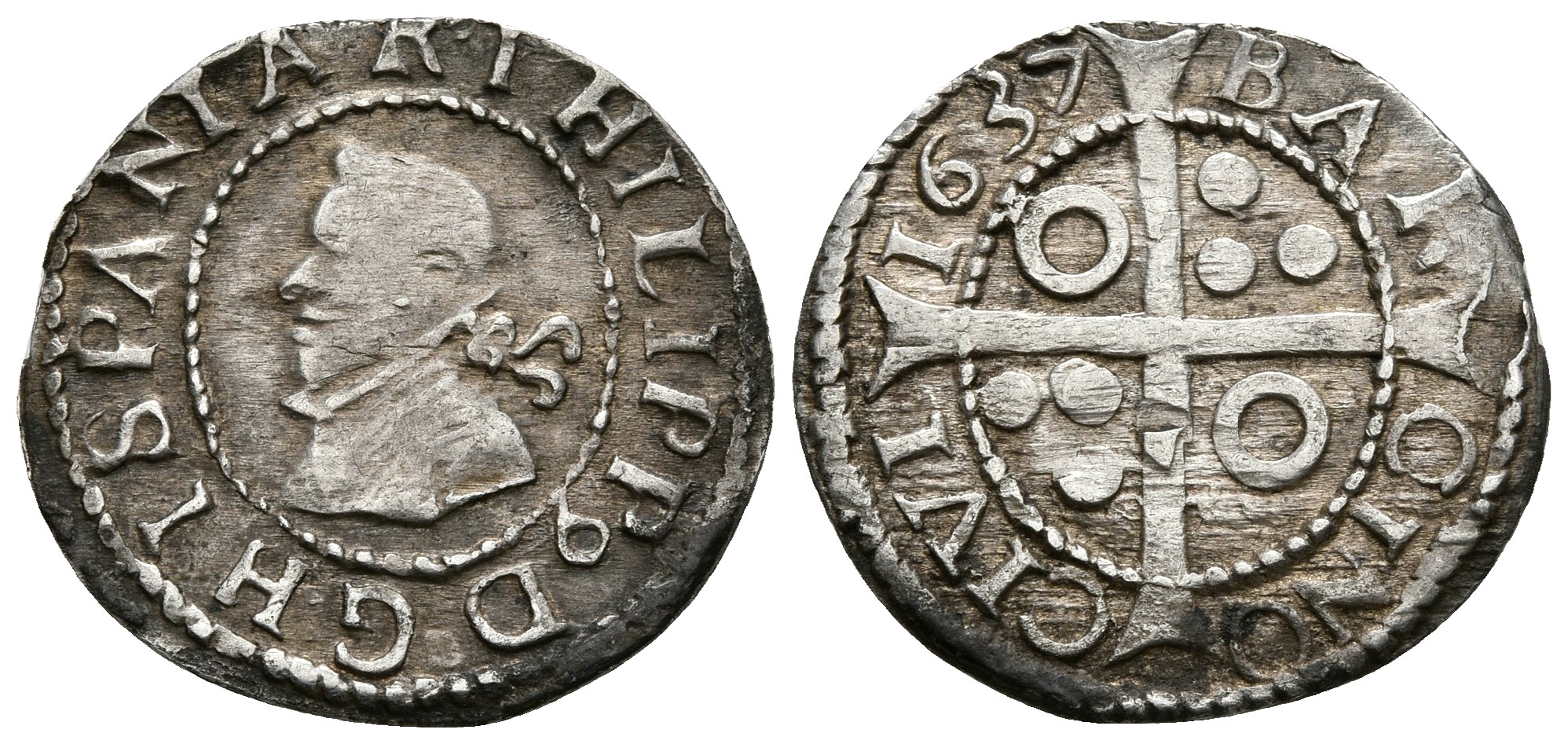 FELIPE IV. 1 Croat. 1637. Barcelona. Cal-978; Cru.C.G. 4414e; Badia 1057. Ar. 2,43g. Pátina. MBC+. Escasa asÃ.