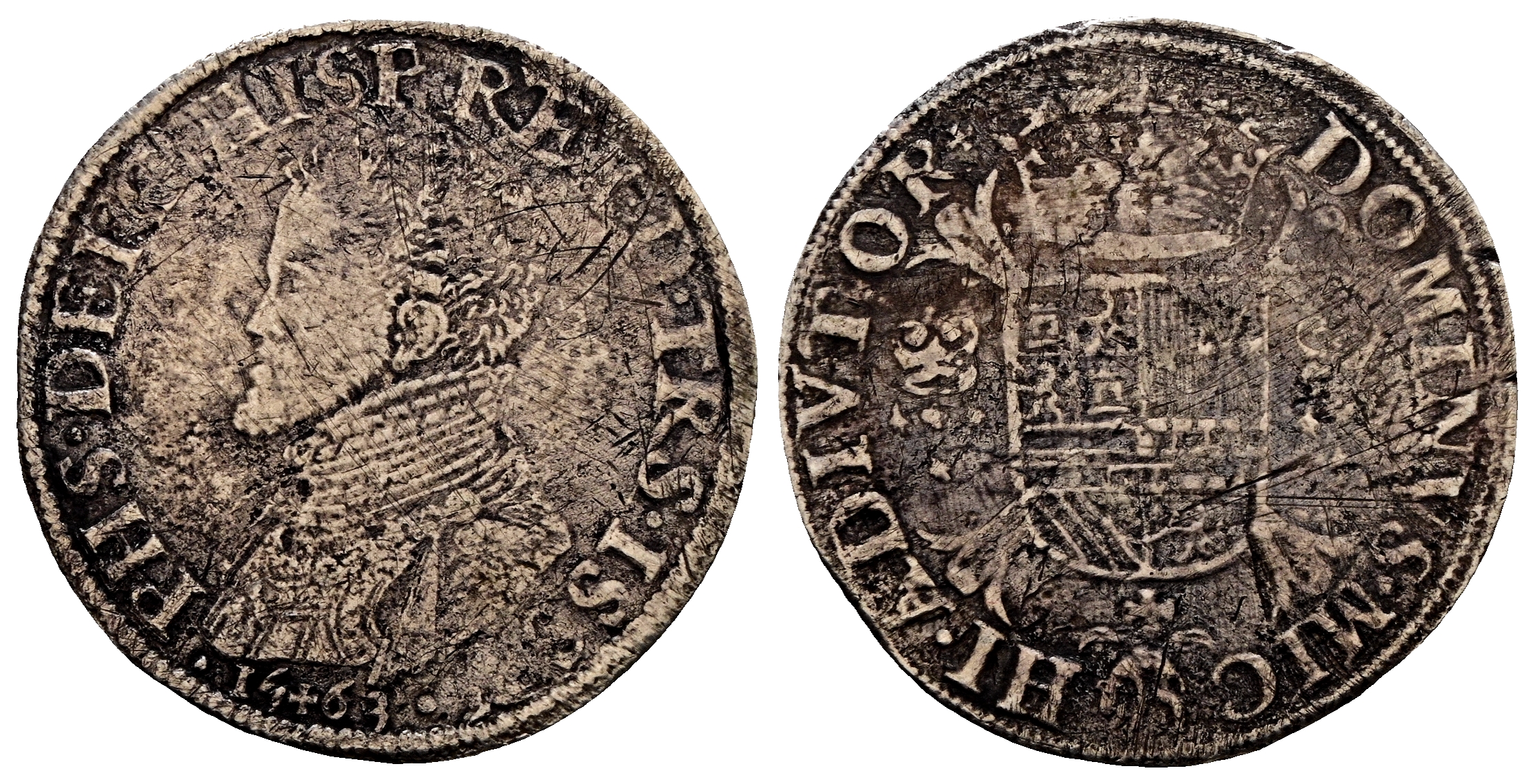 FELIPE II (1556-1598). 1 Escudo Felipe (Ar. 30,89g/41mm). 1563. Hasselt. (Vicenti 1237). BC-. Oxidaciones limpiadas. Rara.