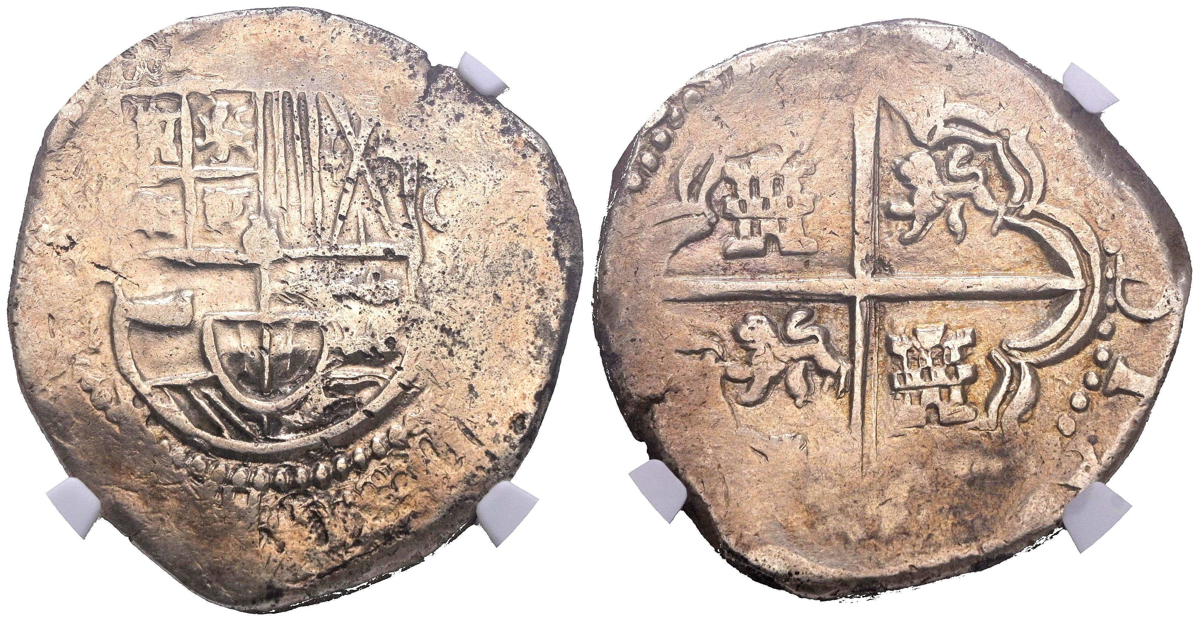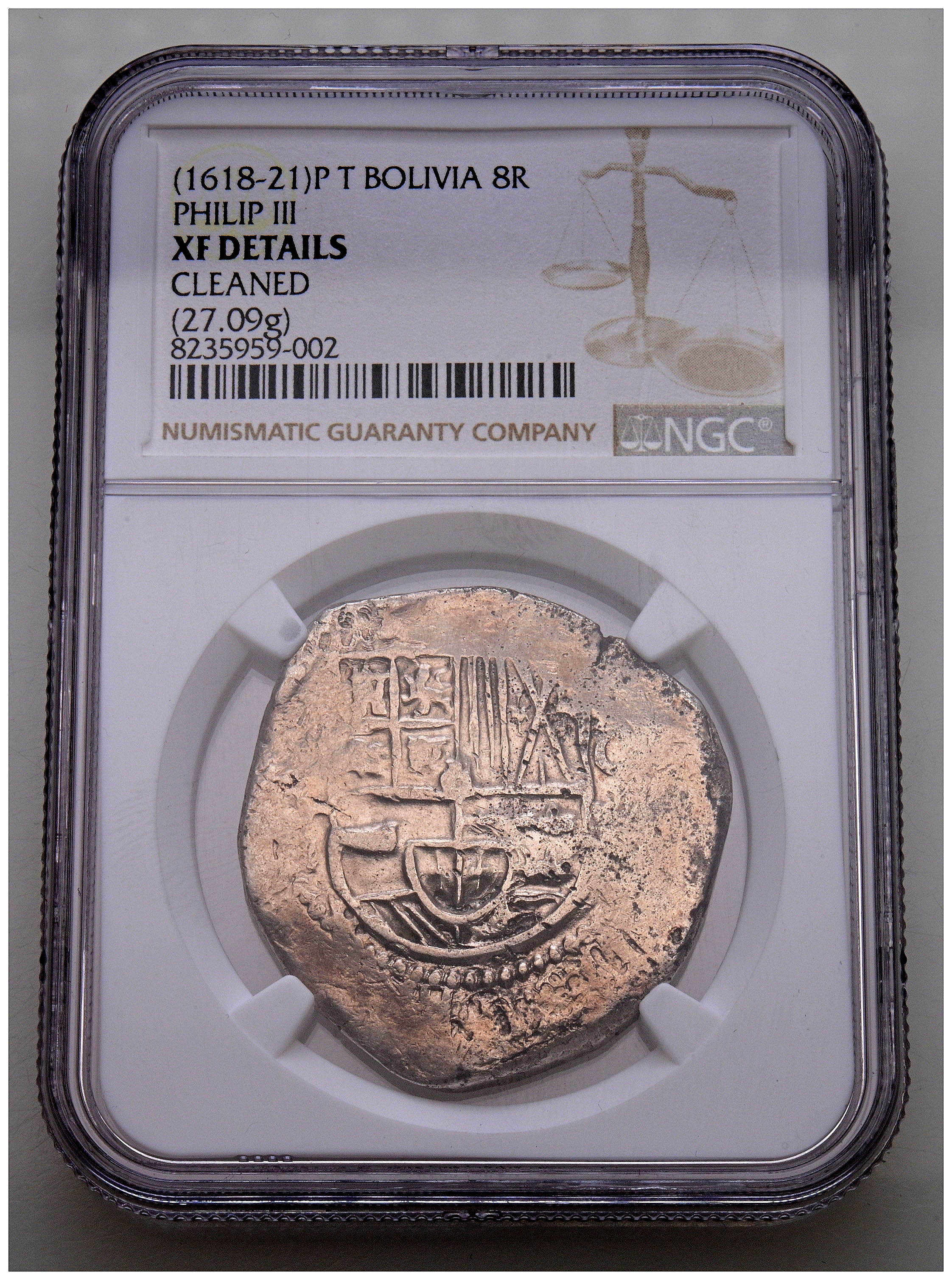 FELIPE III (1598-1621). 8 Reales. (Ar. 27,09g/32mm). Fecha no visible (1618-1621). Potosà B. (Cal-2019-Tipo 165). Encapsulada por NGC XF Details, Cleaned.