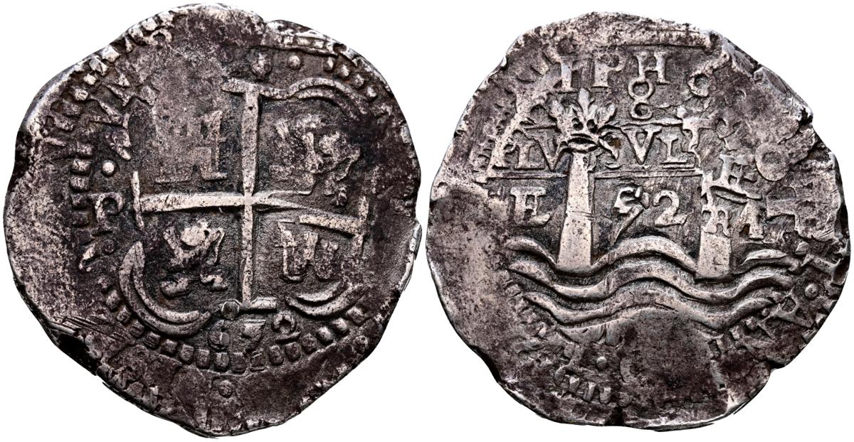 FELIPE IV (1621-1665). 8 Reales. (Ar. 25,67g/38mm). 1652. Potosà E. (Cal-2019-1500). IPH6 bajo la corona en reverso. Doble fecha visible. MBC. Escaso ejemplar.