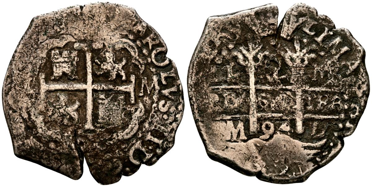 CARLOS II (1665-1700). 2 Reales (Ar. 6,58g/27mm). 1694. Lima M. (Cal-2019-351). Único año de este ensayador, triplemente visible. Nombre del rey y "LIMA" visible. MBC-. Bonito ejemplar, escaso así.