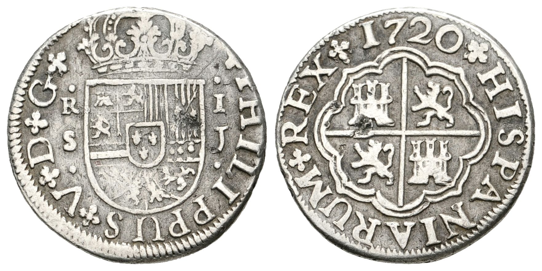 FELIPE V. 1 Real. 1720. Sevilla J. Cal-1708. Ar. 1,89g. MBC-. RarÃsima. Ex Numisma 113.