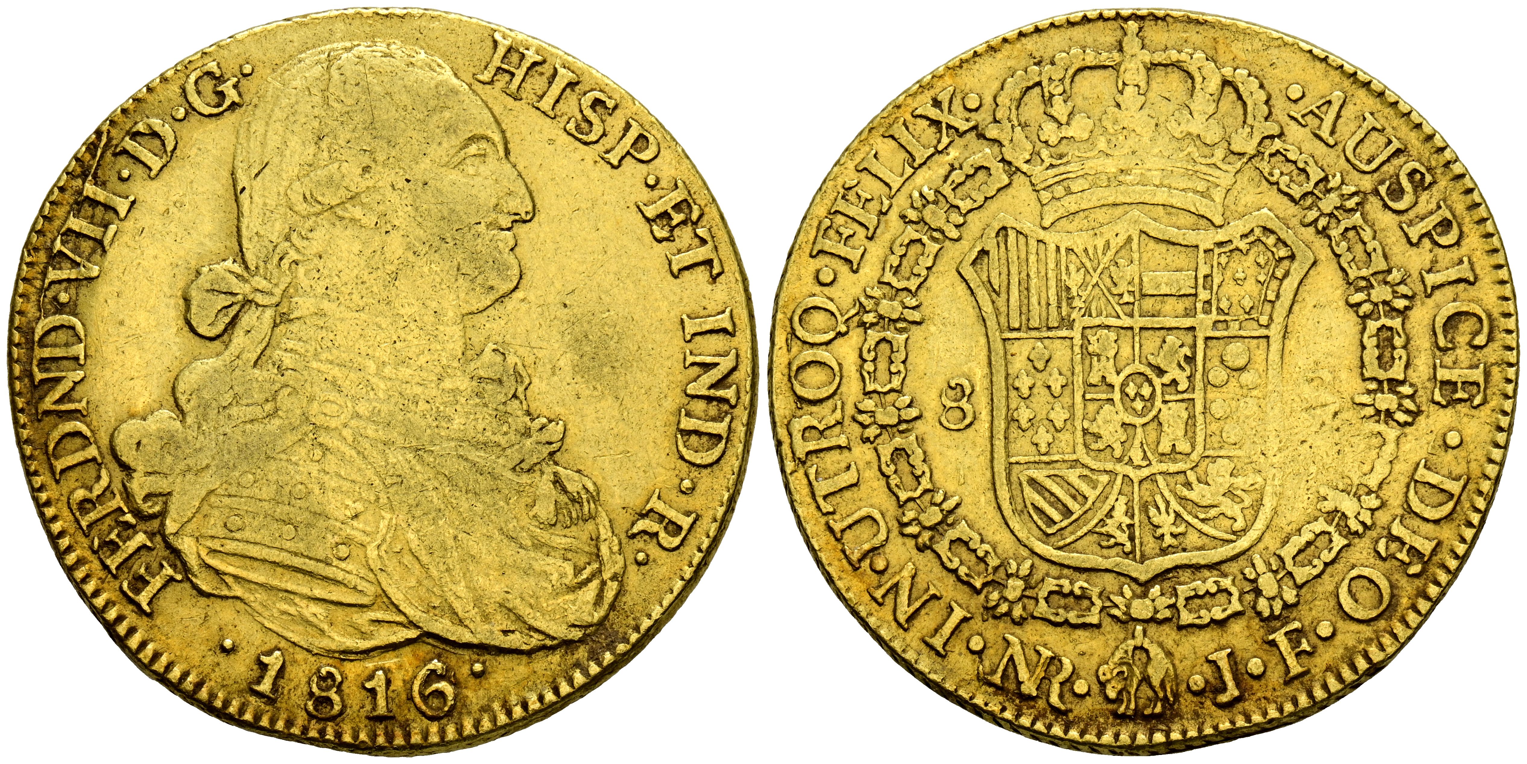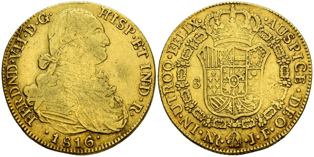 FERNANDO VII (1808-1833). 8 Escudos. (Au. 26,82g/36mm). 1816/4. Nuevo Reino JF. (Cal-2109-1850). MBC. Escasa sobrefecha.