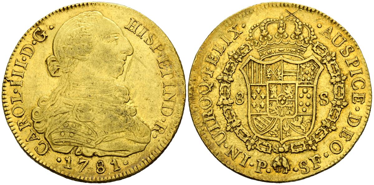 CARLOS III (1759-1788). 8 Escudos. (Au. 27,08g/37mm). 1781. Popayán SF. (Cal-2019-2049). MBC+. Pequeño graffiti en forma de aspa en reverso.