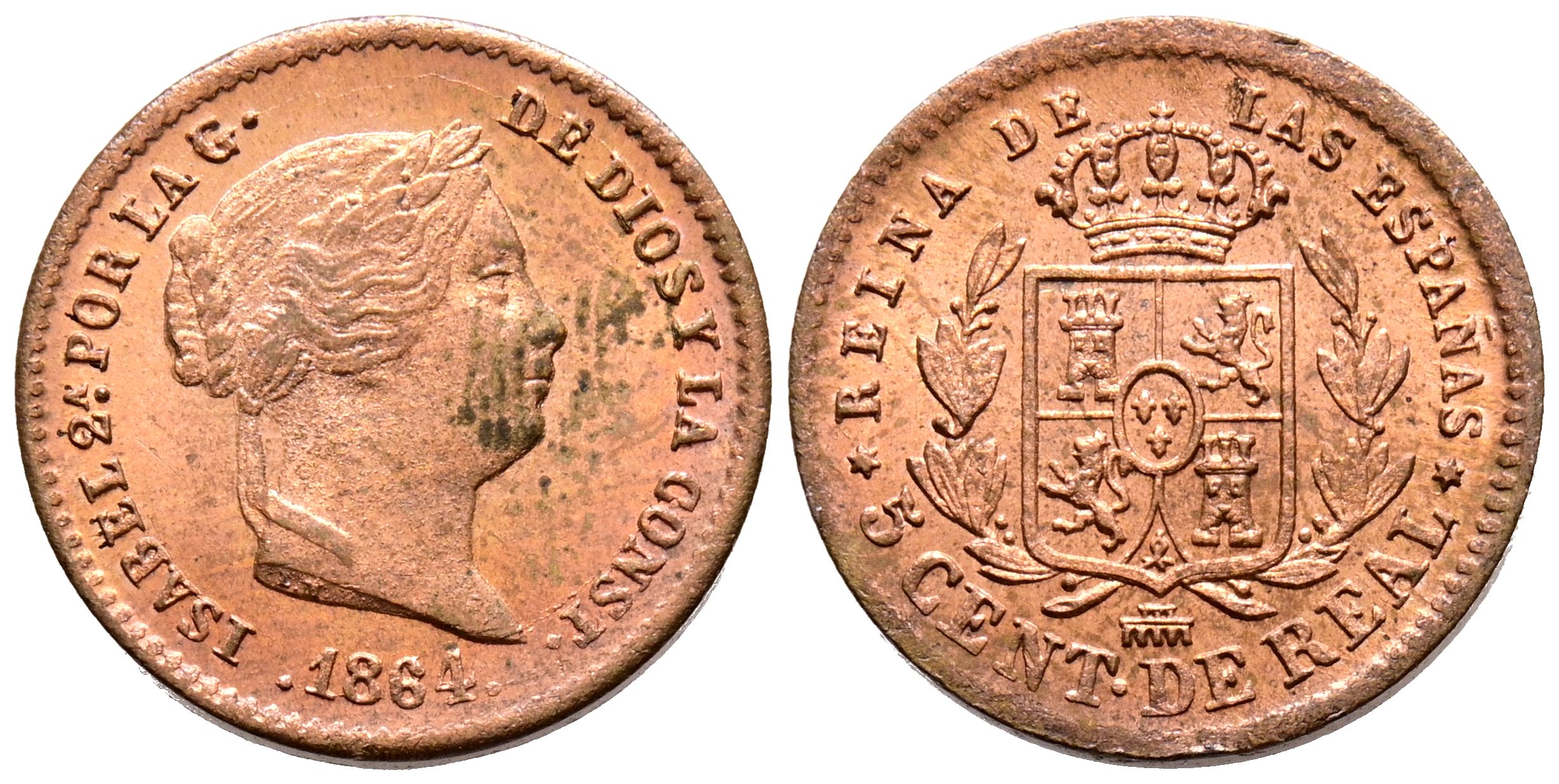 ISABEL II (1833-1868). 5 Céntimos de Real. (Ae. 1,97g/17mm). 1864. Segovia. (Cal-2019-169). SC-. Magnífica pieza que mantiene el brillo y color original, escaso así.