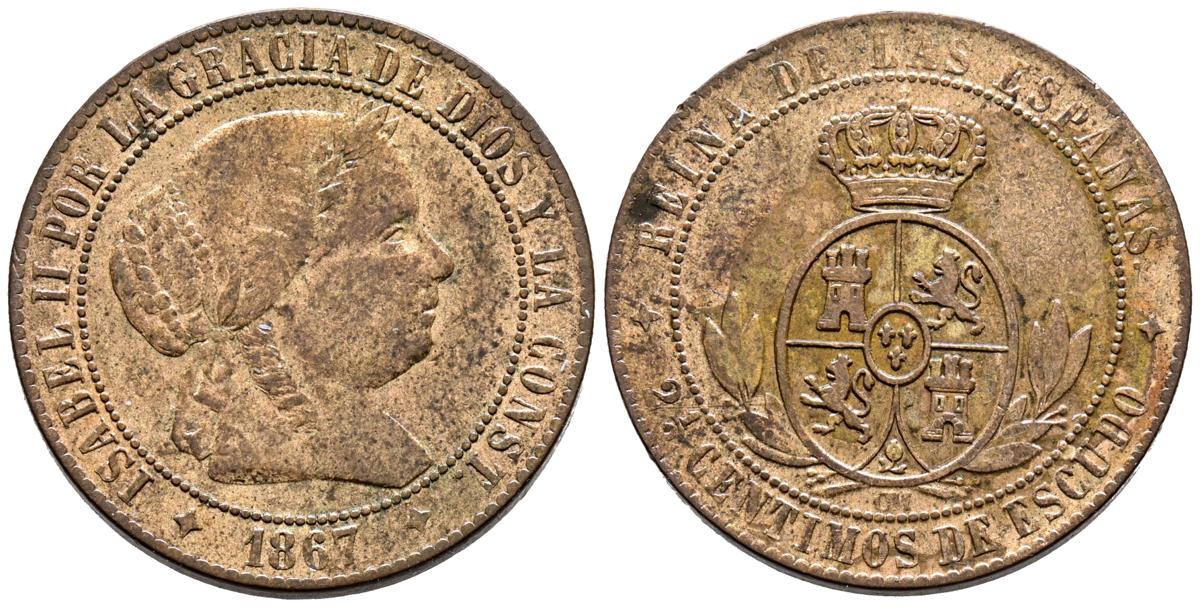 ISABEL II (1833-1868). 2 1/2 Céntimos de Escudo. (Ae. 6,14g/25mm). 1867. Jubia OM. (Cal-2019-236). MBC.
