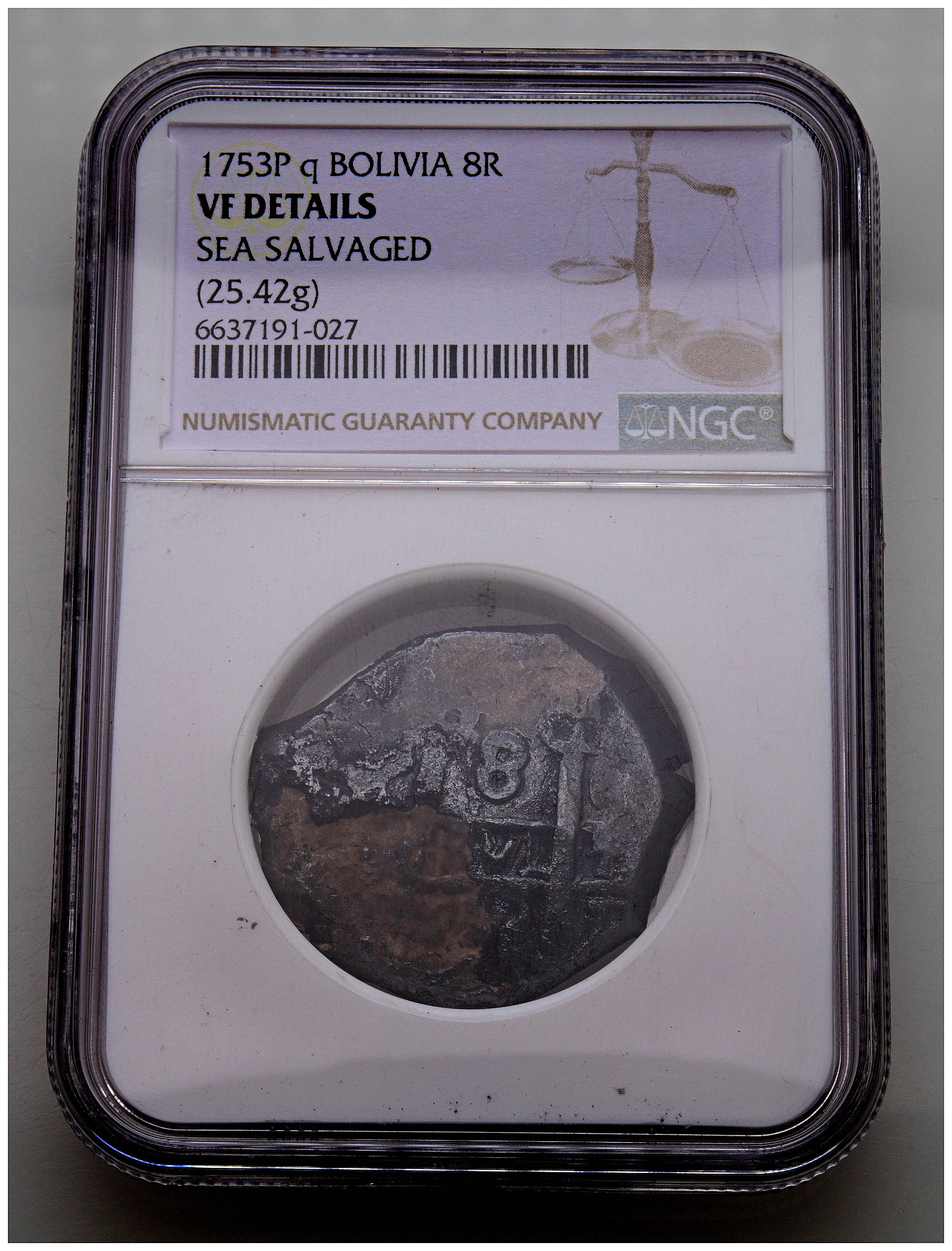 FERNANDO VI (1746-1759). 8 Reales. (Ar. 25,42g/31mm). 1753. Potosà q. (Cal-2019-524). Encapsulado por NGC VF Details, Sea Salvaged.