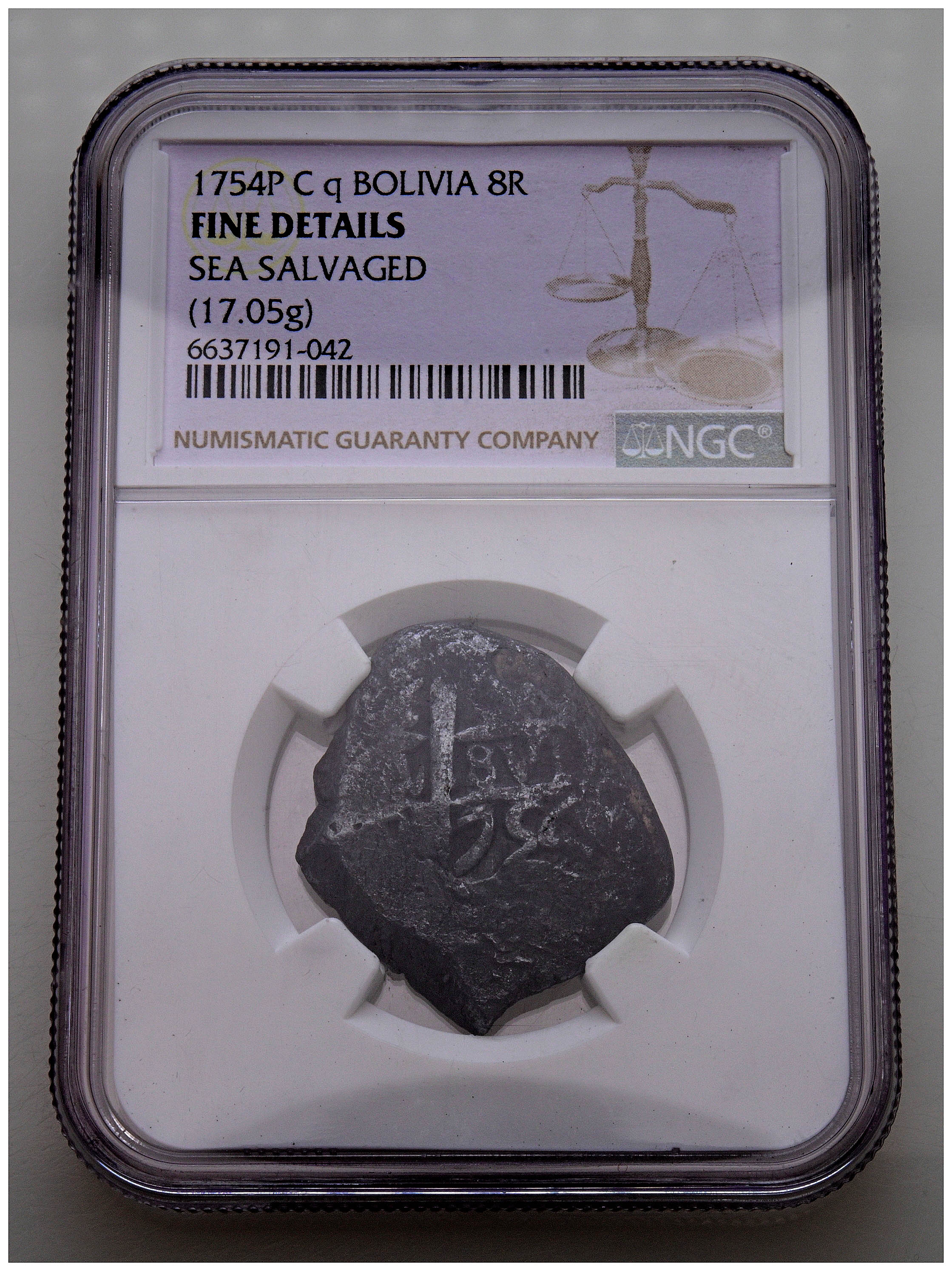FERNANDO VI (1746-1759). 8 Reales. (Ar. 17,05g/28mm). 1754. Potosí q. (Cal-2019-531). Encapsulado por NGC Fine Details, Sea Salvaged.