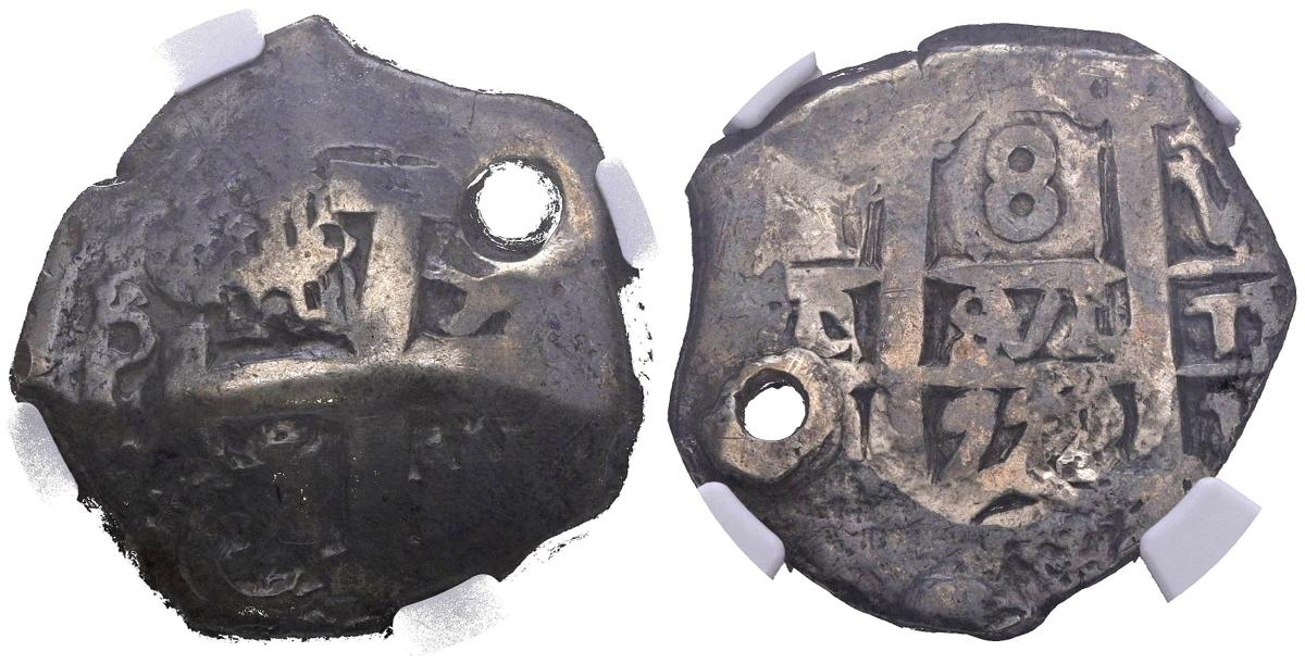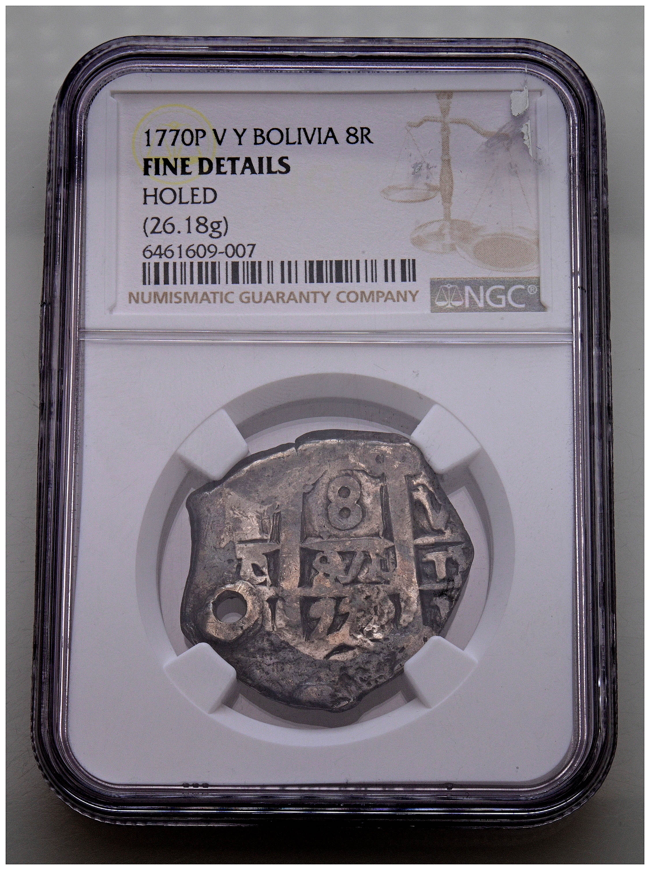 CARLOS III (1759-1788). 8 Reales. (Ar. 26,18g/30mm). 1770. Potosà VY. (Cal-2019-1150). Encapsulado por NGC Fine Details, Holed.