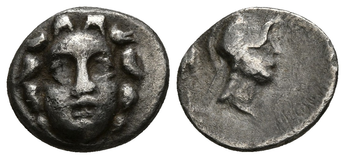 PISIDIA, Selge. Obolo. 350-300 a.C. A/ Gorgona de frente. R/ Cabeza de Athenas a derecha. SNG von Aulock 5242. Ar. 1,01g. MBC.