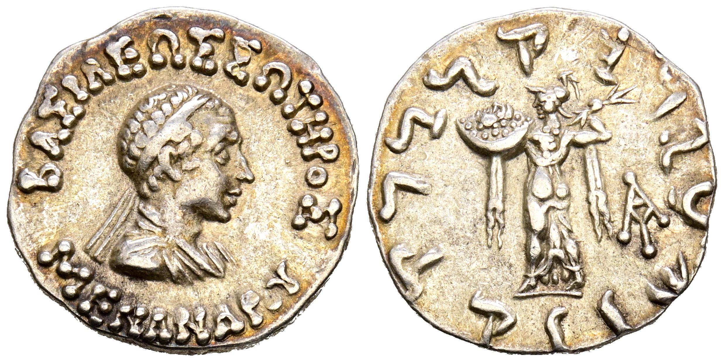 BACTRIA, Menander I. Dracma. (Ar. 2,45g/17mm). 155-130 a.C. (HGC 12, 191). Anv: Busto laureado y drapeado a derecha, alrededor leyenda. Rev: Atenas estante a izquierda portando escudo y lanza, detrás monograma, alrededor leyenda. EBC-.
