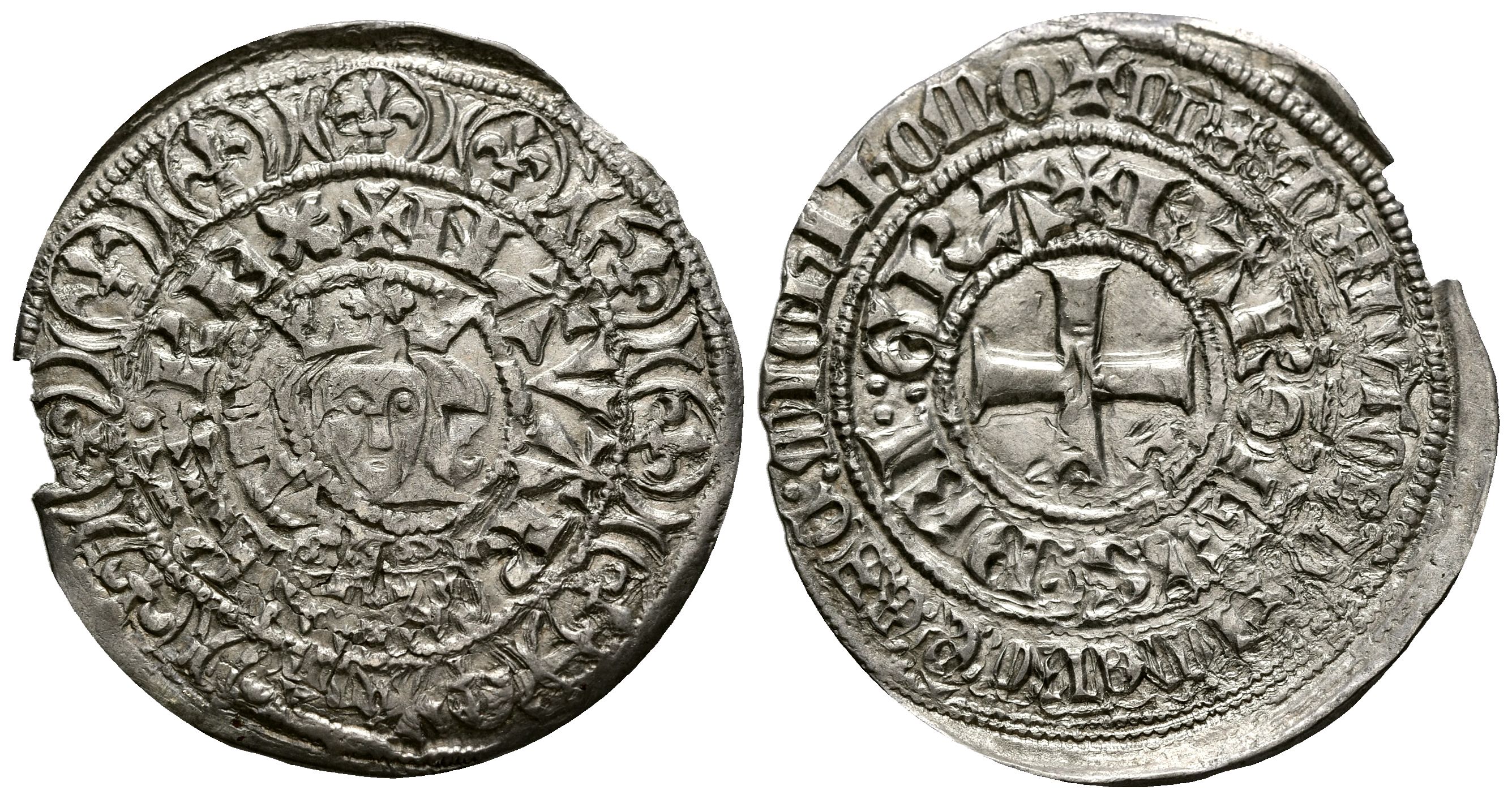 CARLOS El Malo (1349-1387). Gros. (Ar. 3,41g/30mm). Navarra. (Cru.V.S. 233 var). Anv: Busto coronado de frente, alrededor leyenda: NAVARRE REX, en la orla exterior flores de lis. Rev: Cruz patada, alrededor leyenda: KAROLVS DEI GRA/DNS MAIVTOR N TIMEBO CEAC MICHI HOMO. EBC-. Raro ejemplar y más así.Desde el punto de vista numismático, Carlos II de Navarra, apodado “el Malo”, ha pasado a la historia como uno de los falsificadores de monedas más famosos del medievo. No resulta extraño que ante una coyuntura de especial dificultad económica se acuda a la acuñación de moneda de necesidad, a la imitación de tipos o a la fórmula de rebajar el contenido en plata de la moneda como medio para conseguir mayores beneficios para la hacienda. A partir de 1350 esta última práctica se convierte en habitual tanto en sus territorios de Normandía como en el reino de Navarra. Se acuñan, en principio, los conocidos como gruesos (gros) torneses, pero a partir de 1380 presentan la novedad iconográfica de la sustitución del castillo tornés por el busto frontal del monarca (de clara inspiración inglesa). Según cita Miguel Ibáñez Artica: "De nuevo asistiremos a una caída en picado de la ley de la moneda que comienza con un 83,3% en plata para terminar con un 50% en 1386. El mismo monarca es consciente del quebranto producido en la moneda y en la orden de acuñación, se menciona el escándalo producido y la vergüenza que pasa el propio rey obligado a realizar tales emisiones. Gracias a esta devaluación, Carlos II obtenía en año y medio la nada despreciable cantidad de 30.000 libras de beneficios."