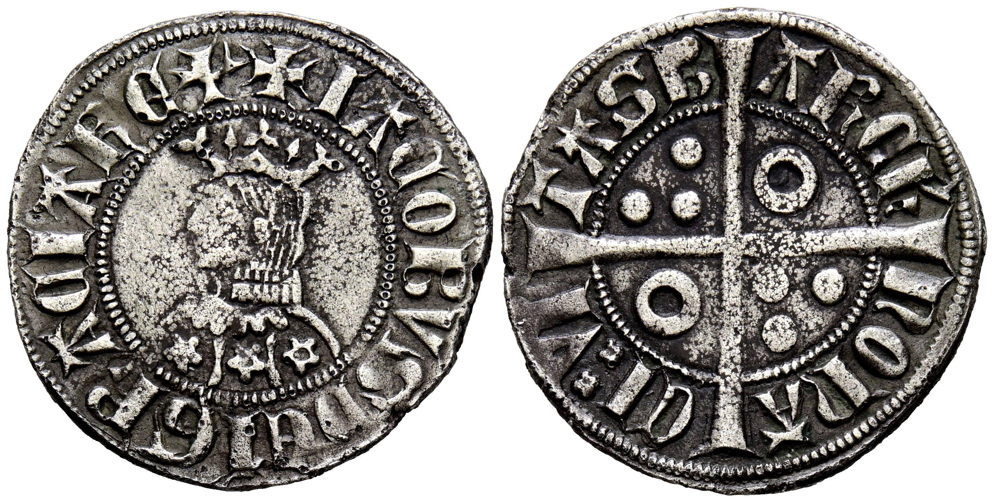 JAIME II (1291-1327). 1 Croat. (Ar. 4,00g/24mm). Barcelona. (Cru V.S. 333). Anv: Busto coronado de Jaime II a izquierda dentro de gráfila de puntos, alrededor leyenda: IACOBVS DEI GRACIA. Rev: Cruz partiendo la leyenda con tres puntos en 1º y 4º cuadrante y roeles en 2º y 3º cuadrante, alrededor leyenda: CIVITAS BARChNONA. MBC+.