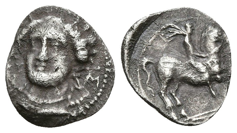 EMPORITON. Obolo. Sant Martà de Empúrias (Gerona). 450-400 a.C. A/ ¿Cabeza de Ceres? de frente, a derecha leyenda E.M. a ambos lados R/ Jinete a derecha, con clámide. FAB-1084. Ar. 0,59g. MBC+. Muy rara.