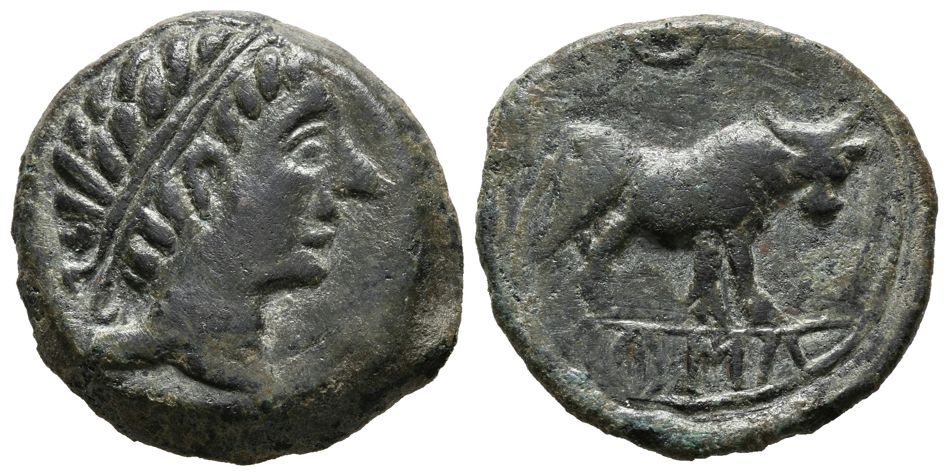 CASTULO (Cazlona, Jaén). Semis. (Ae. 6,01g/20mm). 180 a.C. (FAB-711 var). Anv: Cabeza masculina con diadema a derecha,. Rev: Toro a derecha, encima creciente, debajo de lÃnea leyenda retrógrada: CaSTeLE. MBC+. Repasado.