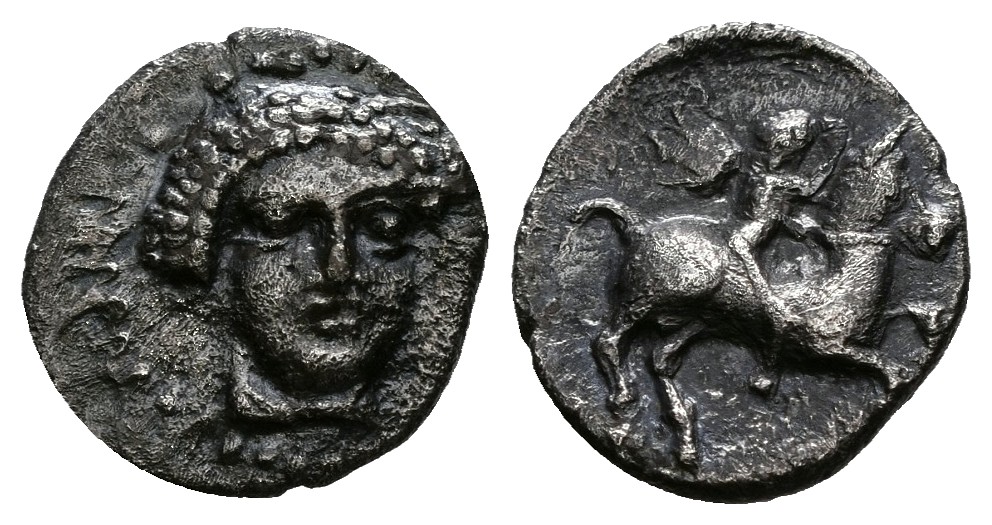 EMPORION (Ampurias, Gerona). Obolo. (Ar. 0,64g/10mm). Siglo V a.C. (ca.). (Villaronga 17). Anv: Cabeza femenina de frente con cabello punteado. Rev: Jinete con clámide y brazo levantado a derecha. EBC-. RarÃsimo ejemplar.