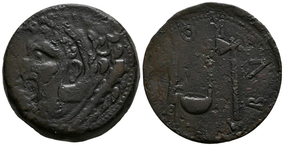 GADES (Cádiz). Sestercio. (Ae. 35,81g/32mm). 27 a.C.-14 d.C. (FAB-1364). Anv: Cabeza de Hércules a izquierda, detrás clava. Rev: Cuchillo, sÃmpulo y hacha, alrededor leyenda con lectura externa: PONT BALBVS. MBC. Muy raro.