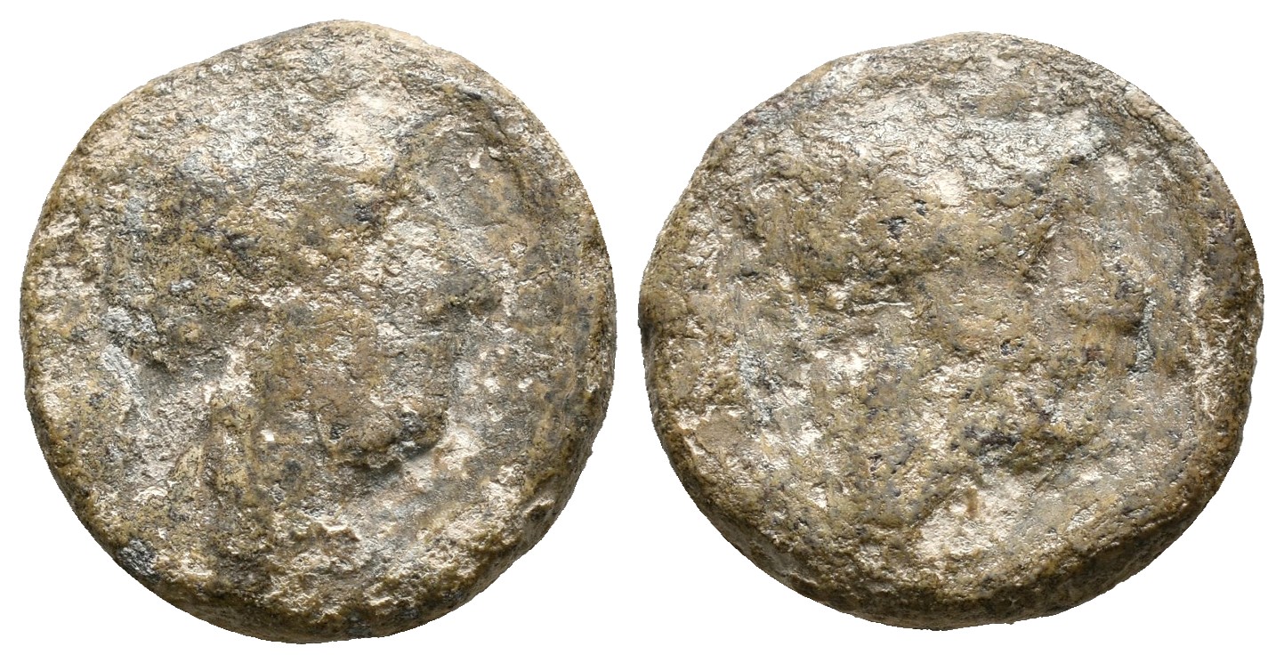 INCIERTO. Plomo monetiforme. (Pb. 5,91g/17mm). (CCP-5). Anv: Cabeza con casco a derecha. Rev: Cabeza con casco a dereca. MBC-. Raro.