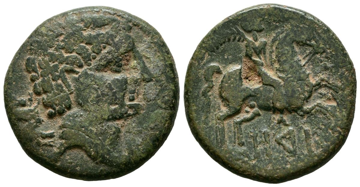 ORE (Orera, Zaragoza). As. (Ae. 12,07g/25mm). 120-20 a.C. (FAB-1897). Anv: Cabeza masculina a derecha, detrás toro. Rev: Jinete con palma a derecha, debajo leyenda ibérica: ORE. MBC. Pátina verde. Intento de perforación en reverso. Escaso ejemplar.