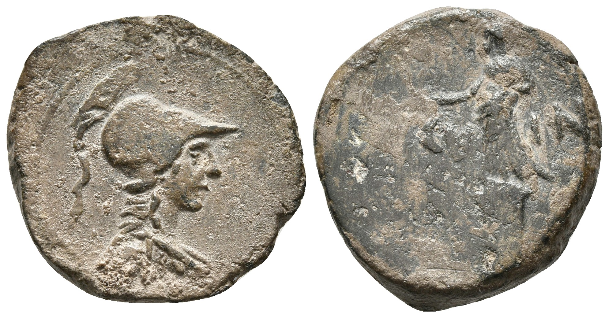 CARTAGONOVA. Semis. 50-30 a.C. Cartagena (Murcia). A/ Cabeza femenina con casco a derecha. R/ Estatua, a los lados C.V.I.N. FAB-571. Ae. 6,28g. EBC-/MBC-.