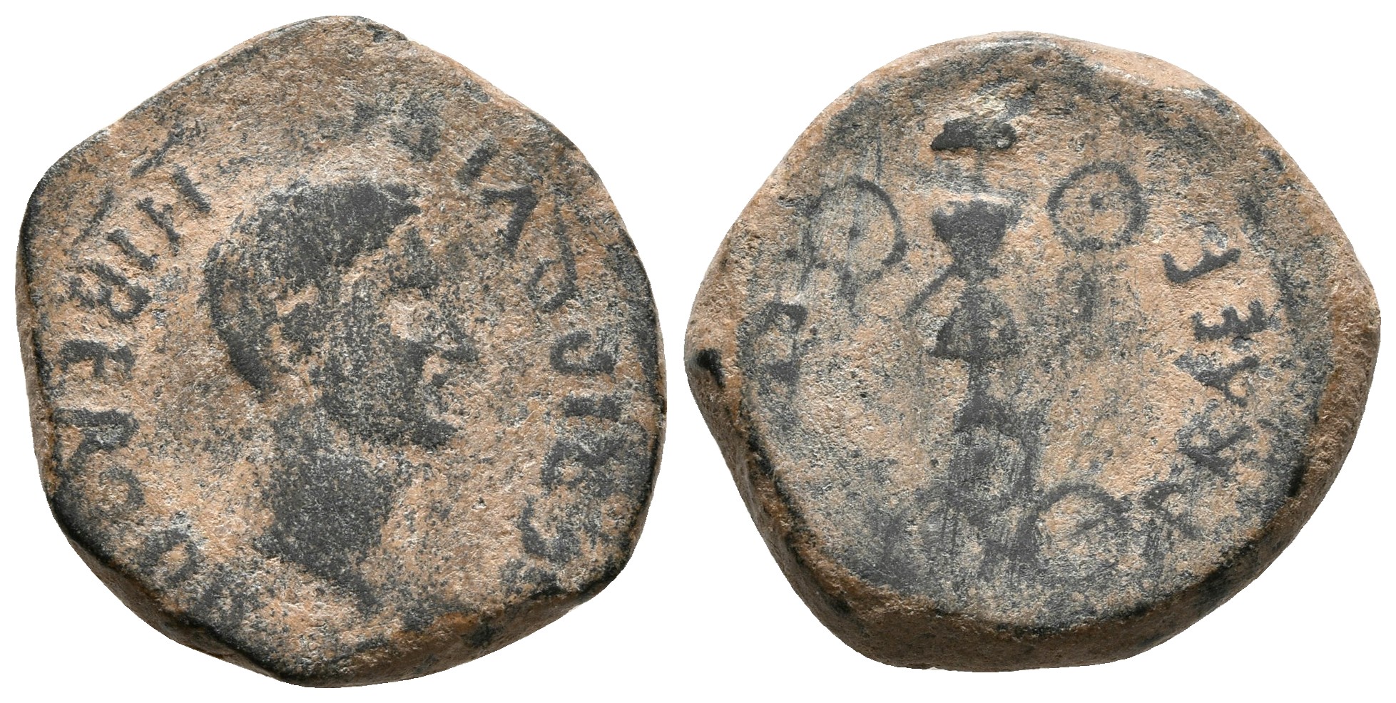 CARTAGONOVA. Semis. Epoca de Augusto. 27 a.C.-14 d.C. Cartagena (Murcia). A/ Cabeza masculina a derecha. HIBERO PRAEF. M. AGRIP. QVIN. R/ Trofeo sobre escudos. L. BENNIO PRAEF. FAB-589. Ae. 6,75g. MBC.