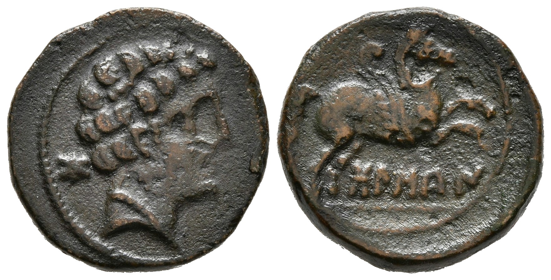 BOLSCAN. Semis. 180-20 a.C. Huesca. A/ Cabeza masculina a derecha, detrás letra ibérica Bo. R/ Pegaso a derecha, debajo BoLSCaN. FAB-1921. Ae. 4,64g. MBC.