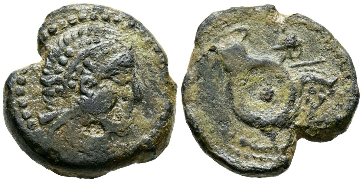 CARISA (cerca de Bornos, Cádiz). Semis. (Ae. 5,71g/19mm). 50 a.C. (FAB-448). Anv: Cabeza masculina diademada a derecha. Rev: Jinete con lanza y escudo a derecha, debajo leyenda invertida: CARIS. MBC. Cospel faltado.