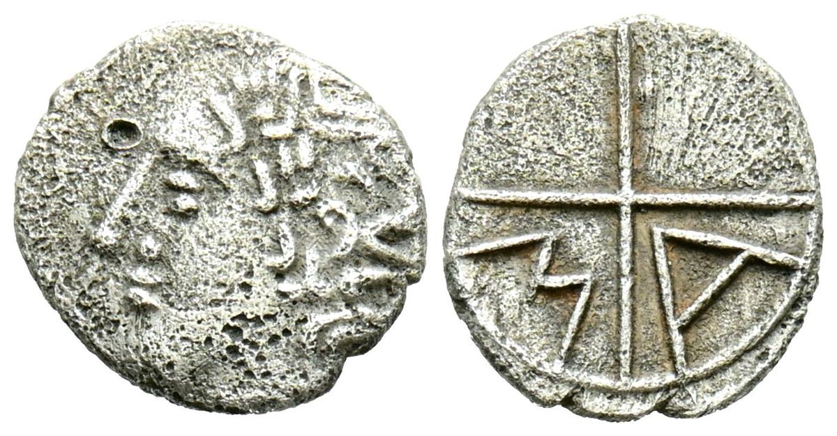 DIVISORES DE IMITACION DE MASSALIA. Trietartemorion. (Ar. 0,58g/10mm). 200-110 a.C. (FAB-1181). Anv: Cabeza masculina a izquierda. Rev: Rueda de cuatro ruedas, en el 3º y 4º cuadrante letras: M-A. MBC.