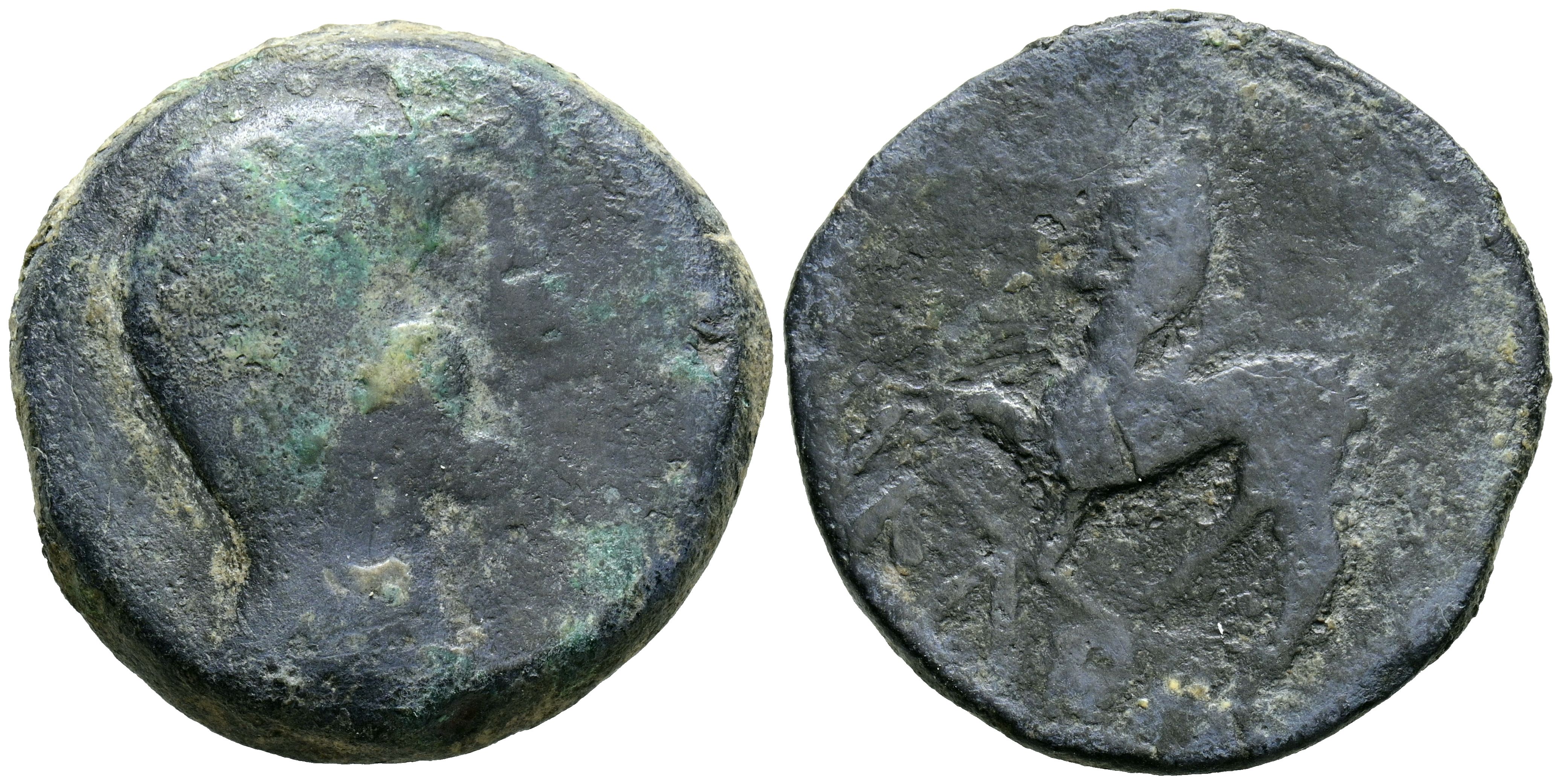 ILIBERRI (Granada). As. (Ae. 18,08g/29mm). 150-20 a.C. (FAB-1498). Anv: Cabeza masculina a derecha. Rev: Esfinge a izquierda, debajo leyenda ibérica: ILBeRI. BC+. Escaso ejemplar.