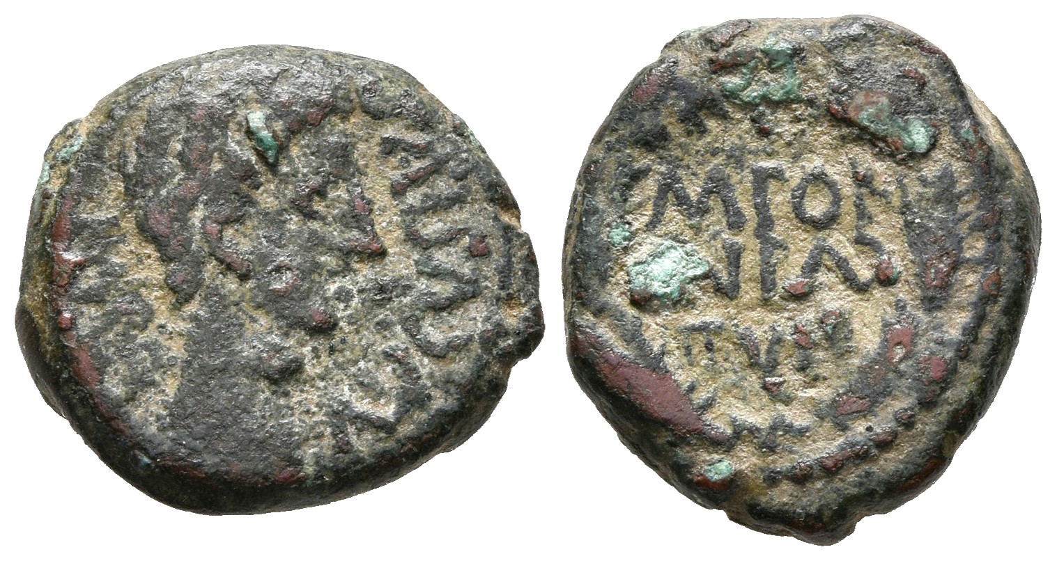 CAESARAUGUSTA. Cuadrante. Epoca de Augusto. 27 a.C.-14 d.C. Zaragoza. A/ Cabeza desnuda de Augusto a derecha. AVGVSTVS.IMP. R/ Dentro de láurea. M.POR.CN.FAD.II.VIR. FAB-341. Ae. 3,30g. BC+.