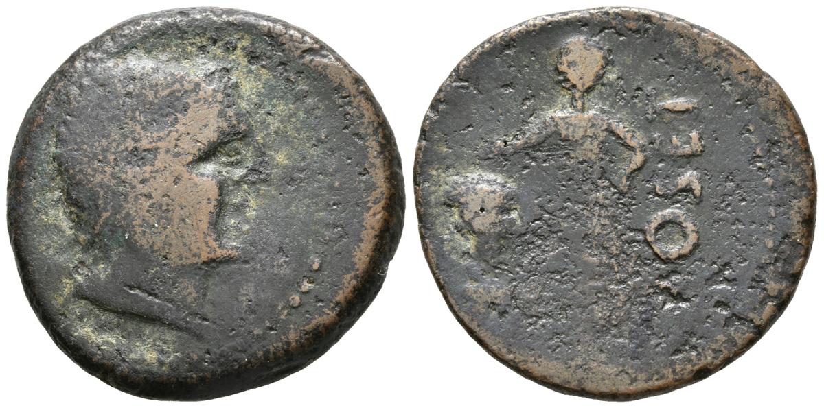 OSET. As. 120-20 a.C. San Juan de Aznalfarache (Sevilla). A/ Cabeza a derecha. R/ Genio de pie con racimo de uvas a izquierda a la derecha OSSET. FAB-1947. Ae. 14,67g. BC+. Escasa.