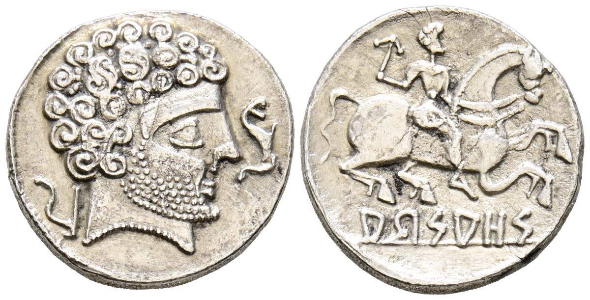 ARSAOS (Zona de Navarra). Denario. (Ar. 4,09g/19mm). 120-80 a.C. (FAB-139). Anv: Cabeza masculina barbada a derecha, delante delfÃn, detrás arado. Rev: Jinete con dardo a derecha, debajo leyenda ibérica sobre lÃnea: ARSAOS. EBC-. Precioso ejemplar, escaso asÃ. Ex Jesús Vico (08/06/2006), Nº Lote 10.