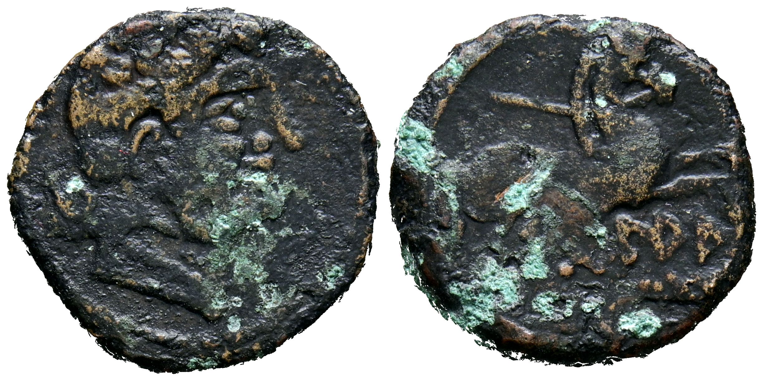 BELAISCOM (Zona de Navarra-Aragón). Semis. (Ae. 3,90g/17mm). 120-20 a.C. (FAB-239). Anv: Cabeza masculina a derecha, detrás letra ibérica: Be. Rev: Caballo saltando a derecha, debajo leyenda ibérica en dos lÃneas: BeLAISCoM. MBC-. Oxidaciones. Raro ejemplar.