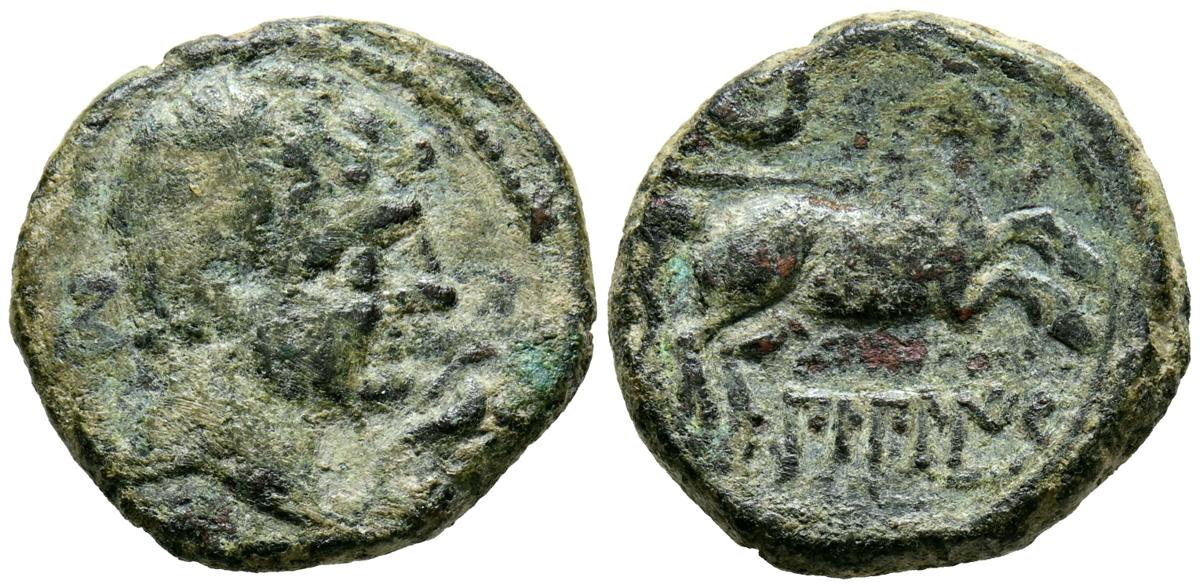 BILBILIS (Calatayud, Zaragoza). Semis. (Ae. 6,53g/21mm). 120-30 a.C. (FAB-266). Anv: Cabeza masculina a derecha, delante delfÃn, detrás letra ibérica: S. Rev: Caballo a derecha, encima creciente, debajo leyenda ibérica: BiLBiLIS. MBC-.