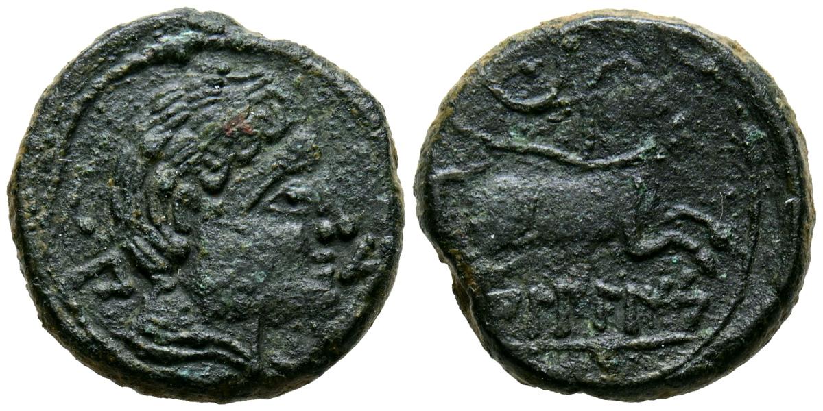 BILBILIS (Calatayud, Zaragoza). Semis. (Ae. 7,15g/20mm). 120-30 a.C. (FAB-267). Anv: Cabeza masculina a derecha, detrás letra ibérica Bi, delante delfÃn. Rev: Caballo saltando a derecha, encima creciente con punto, debajo leyenda ibérica: BiLBiLIS. MBC-.