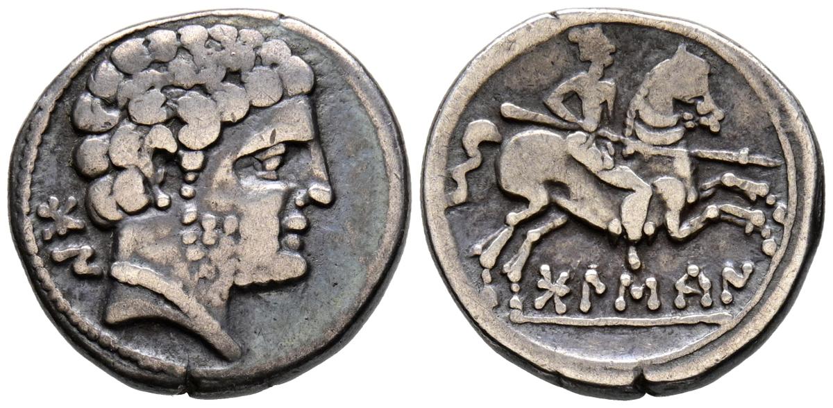 BOLSCAN (Huesca). Denario. (Ar. 4,02g/18mm). 180-20 a.C. (FAB-1911). Anv: Cabeza masculina barbada a derecha, detrás letras ibéricas: BoN. Rev: Jinete con lanza a derecha, debajo leyenda ibérica: BoLSCaN. MBC.