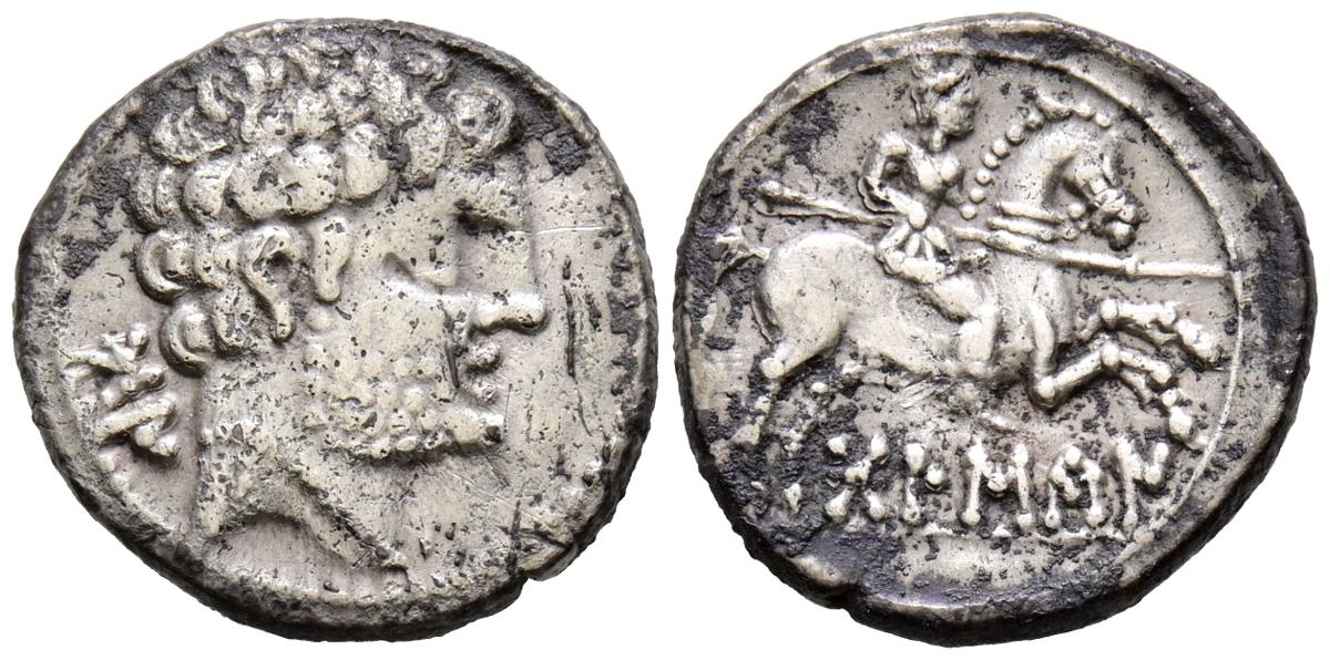 BOLSCAN (Huesca). Denario. (Ar. 3,63g/17mm). 180-20 a.C. (FAB-1911). Anv: Cabeza masculina barbada a derecha, detrás letras ibéricas: BoN. Rev: Jinete con lanza a derecha, debajo leyenda ibérica: BoLSCaN. MBC.